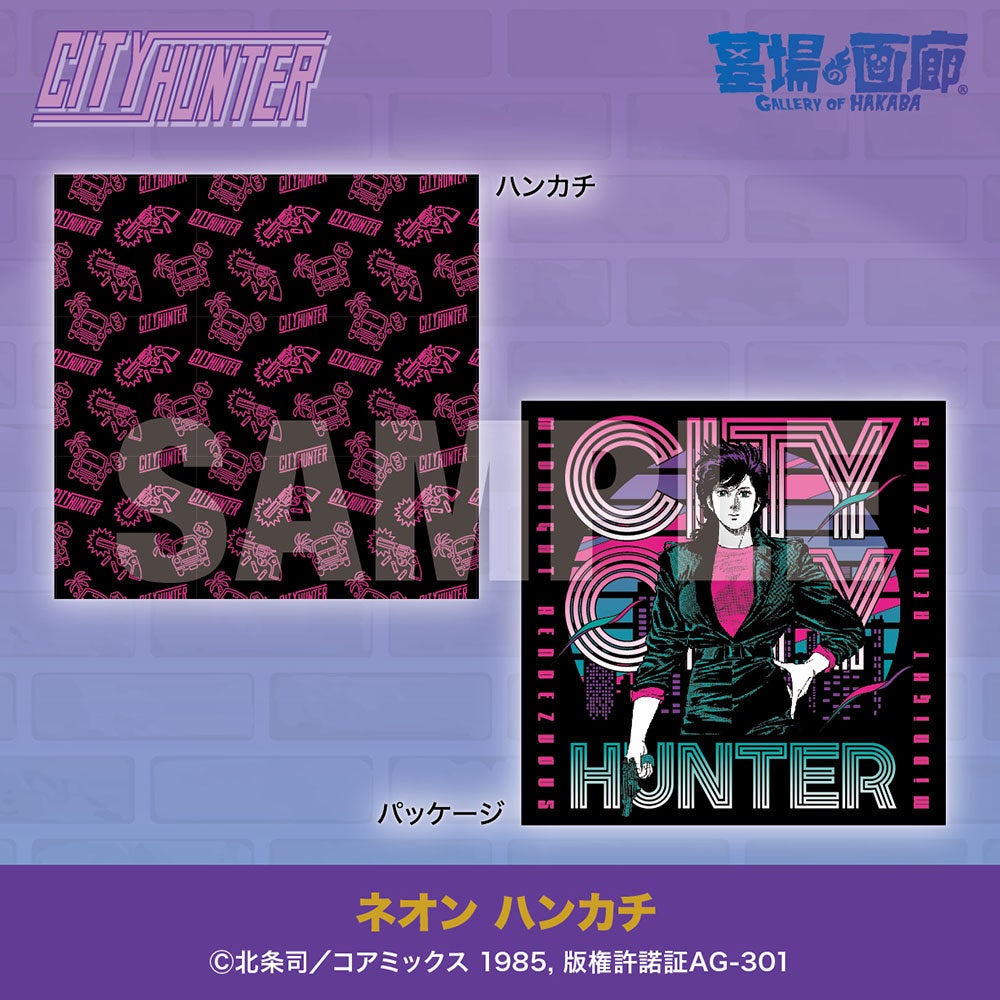 『シティーハンター』の印象的なアイコンが、ポップなネオンサイン風のイラストで描かれた、総柄のハンカチが登場。