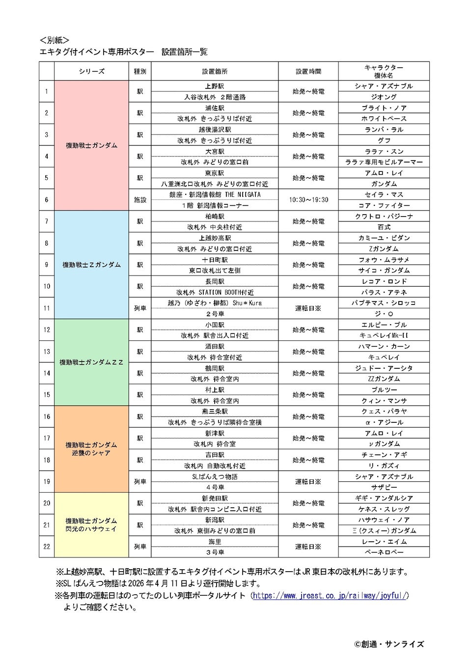 JR東日本では、絶賛公開中の映画『機動戦士ガンダム 閃光のハサウェイ キルケーの魔女』大ヒットを記念して、『機動戦士ガンダム』シリーズとタイアップし、「JR東日本 新潟・庄内 機動戦士ガンダムシリーズ エキタグスタンプラリー ~勝利の栄光を、君に!~」を開催します。