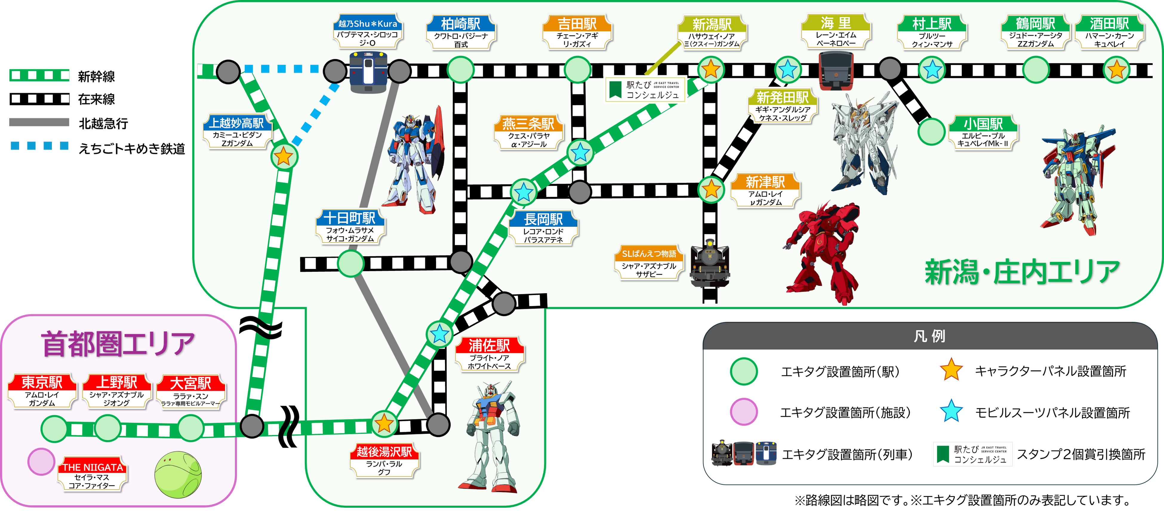 東京駅などの首都圏エリア4箇所と新潟・庄内エリア18箇所の計22箇所のスタンプラリー専用エキタグのスタンプを集めると、限定描き下ろしイラストを使用した特典スタンプなどの賞品を獲得できます。