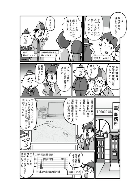 本事故は、渋滞車列に中型トラックがブレーキをかけることなく追突し、車両12台が絡む多重事故に発展、5台が炎上して2名が死亡、67名以上が負傷した重大事故です。事故調査により、運転者の36時間にわたる無睡眠連続勤務による居眠り運転が直接原因であったこと、さらに運行管理者による点呼の形骸化、運行指示書の未作成、過酷な勤務実態の未把握といった管理体制の構造的欠陥が背景にあったことが明らかになっています。刑事裁判では、運転者に懲役4年の実刑判決が、運行管理者にも懲役1 年6カ月(執行猶予3年)の有罪判決がそれぞれ下されました。本漫画ではこれらの経緯に若干のデフォルメを加えながら、わかりやすいストーリー仕立てにすることで、当該事案をより多面的に見る視点を提供いたします。