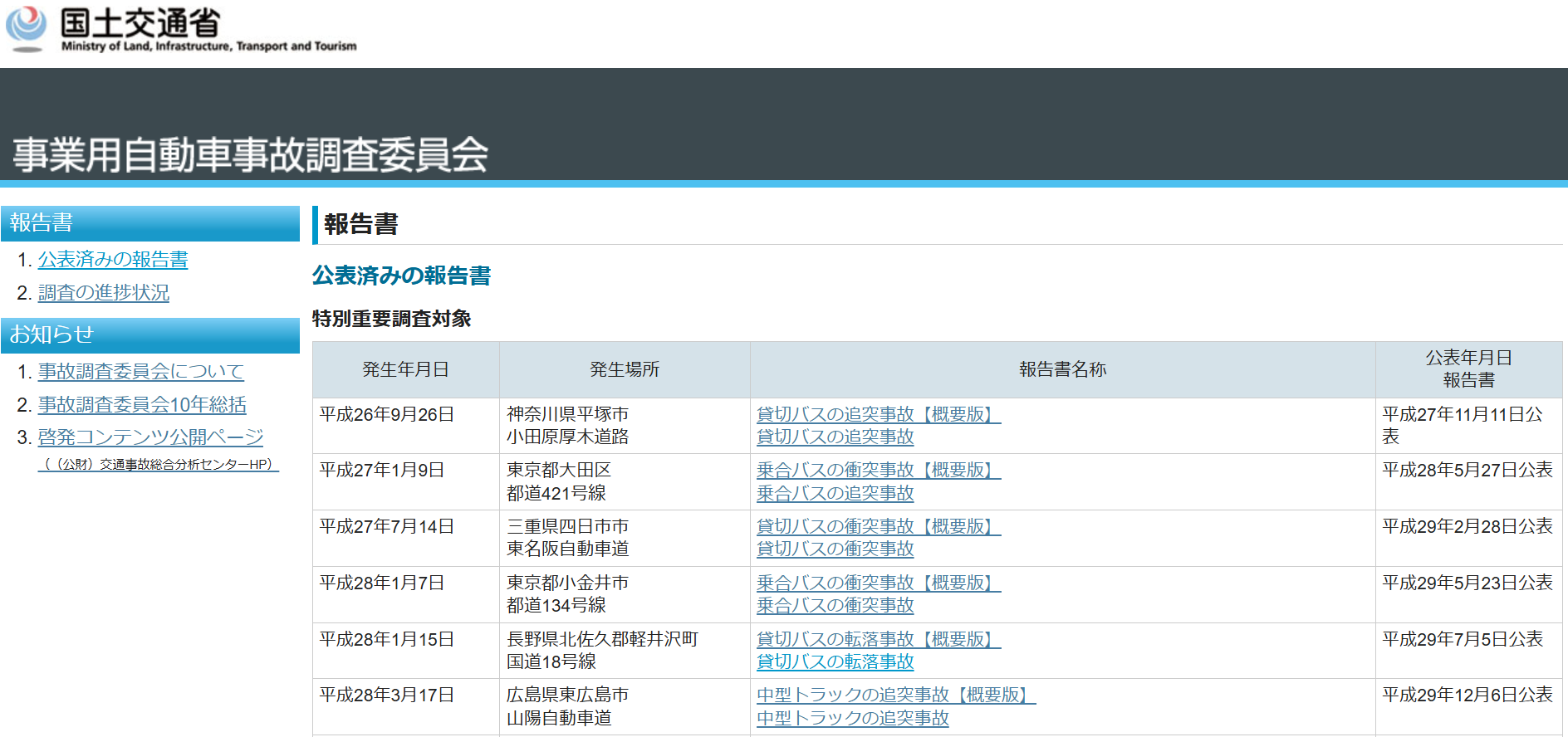 国土交通省の事業用自動車事故調査委員会は、社会的影響の大きい事業用自動車の重大事故について、事故原因の究明と再発防止策の提言を目的とした事故調査報告書を公表しています。しかしながら、本調査には、実際その後刑事裁判で明らかになる動機や状況証拠等の事実認定、真の原因、責任の所在等が含まれていません。