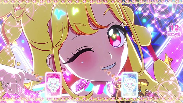 ゲーム『おねがいアイプリ』は、「アイプリカード」をフラットパネルの上に配置して画面に合わせて動かすことで、直感的にリズムゲームができるライブ体験ゲームです。大きな横型のモニターでは、アニメで放送されるライブと同じダンスや演出のライブを楽しむことができ、コーデ(衣装)が光り出す最高体験「バズリウムチェンジ」の成功を目指して、憧れのアニメキャラクターになりきって遊ぶことができます。