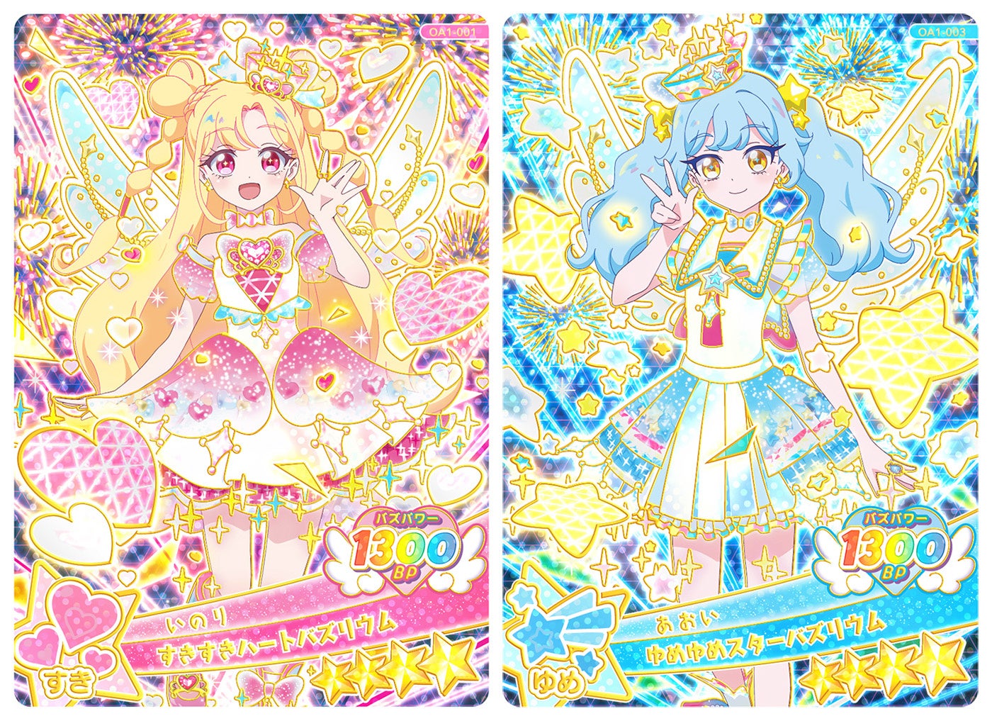 ゲーム『おねがいアイプリ1だん』では、「アイプリ」の象徴である「バズリウムチェンジ」が新しくなります。「バズリウムチェンジ」が成功すると、きらめく“つばさ”がついた「バズリウムコーデ」でライブができるようになります。「1だん」の「バズリウムコーデ」のカードには主人公の「いのり」と「あおい」がラインアップされ、“つばさ”がキラキラと輝くホログラムと箔押しデザインになっています。配出されるアイプリカードは羽根をモチーフにしたフレームをベースにデザインフォーマットを一新し、★2から★4までのレアリティの新たなデザインカードで展開いたします。