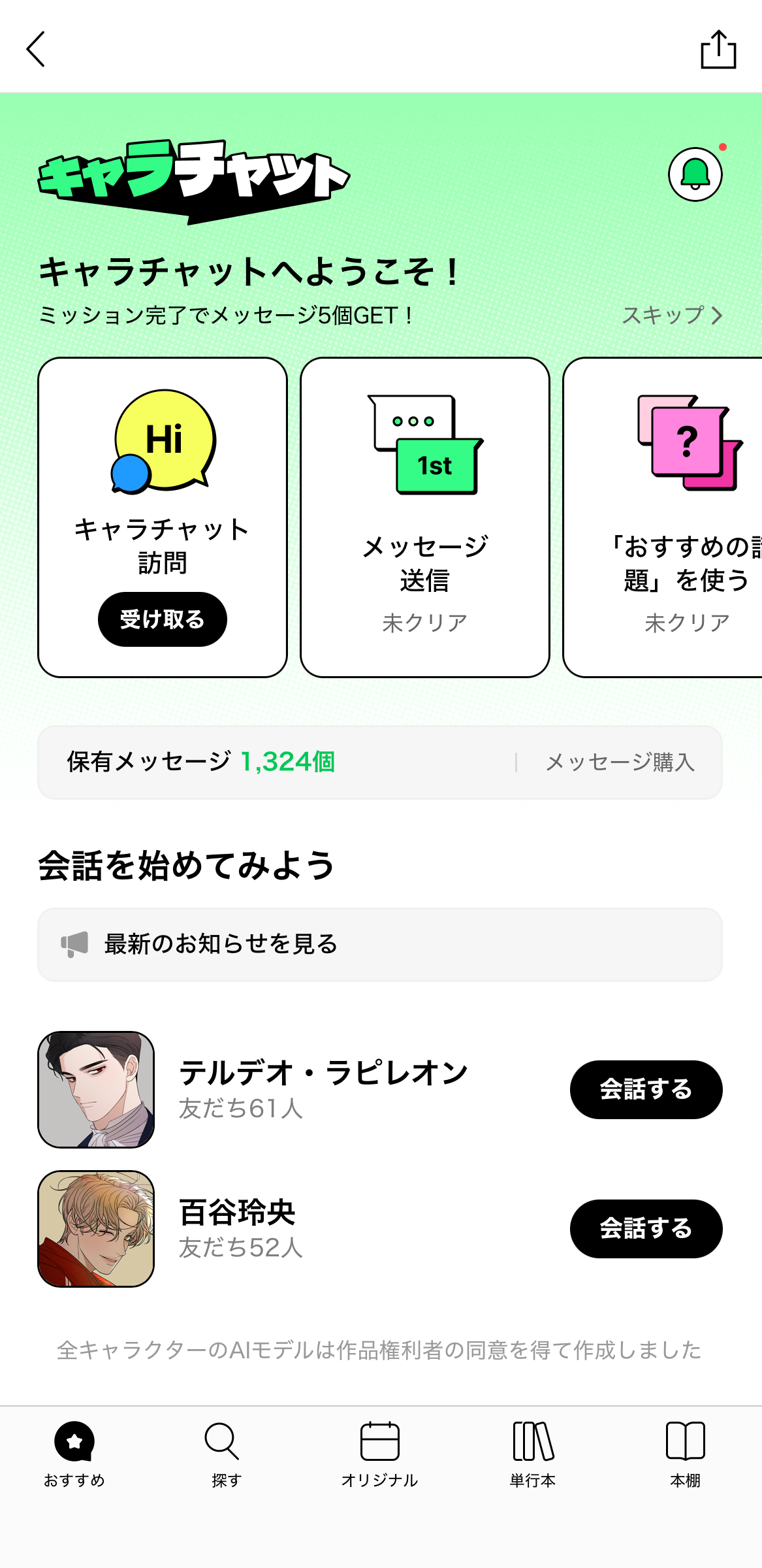 LINEログインした状態で「キャラチャット」へアクセスし、表示されたミッションをクリアすると無料メッセージを獲得できます。また、「LINEマンガ」内のマンガコインを消費してメッセージの購入も可能です。