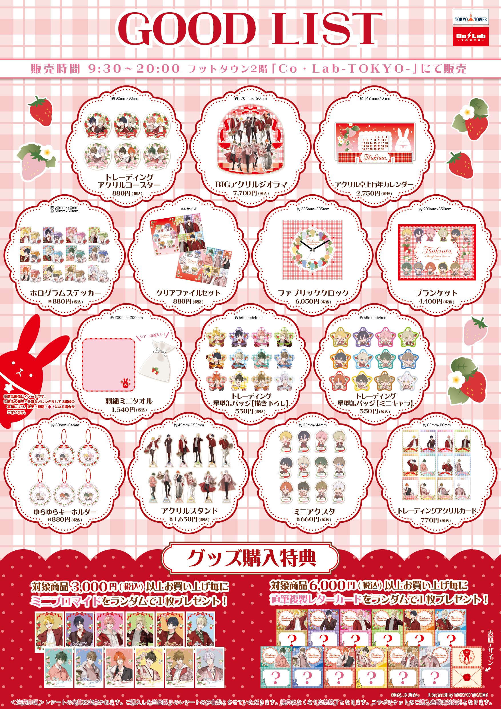 東京タワーフットタウン2階「Co・Lab-TOKYO-」では、『Berryful moon Tower』の為に描き下ろされた春コーデの新規イラストを使用した限定コラボグッズを販売いたします。(全14アイテム90種類)本イベントでしか手に入らない限定デザインのグッズを多数ご用意しております。開催期間中は1会計3,000円(税込)ご購入毎に、【ミニブロマイド】をランダムで1枚プレゼント、さらに6,000円(税込)ご購入毎に【直筆複製レターカード】をランダムで1枚プレゼントいたします。