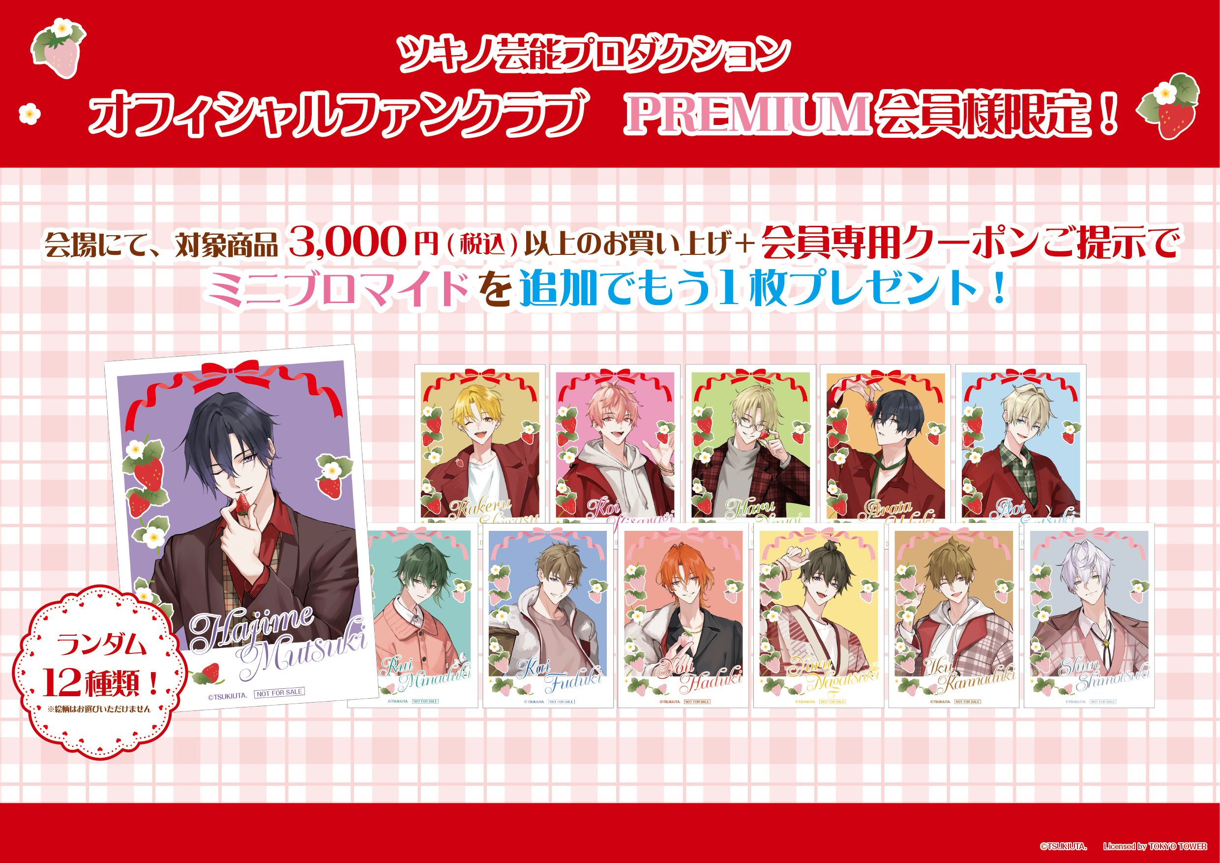 更にツキノ芸能プロダクションオフィシャルファンクラブのPREMIUM会員様には会場にて、対象商品 3,000円(税込)以上のお買い上げ+会員専用クーポンご提示でミニブロマイドを追加でもう1枚プレゼント!