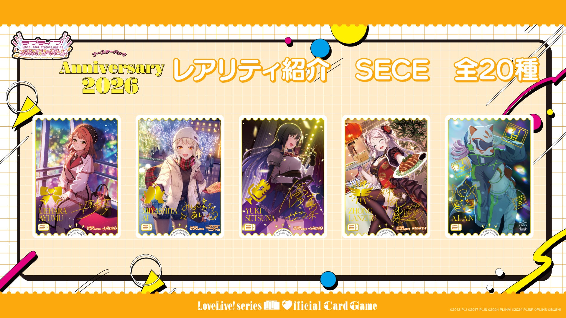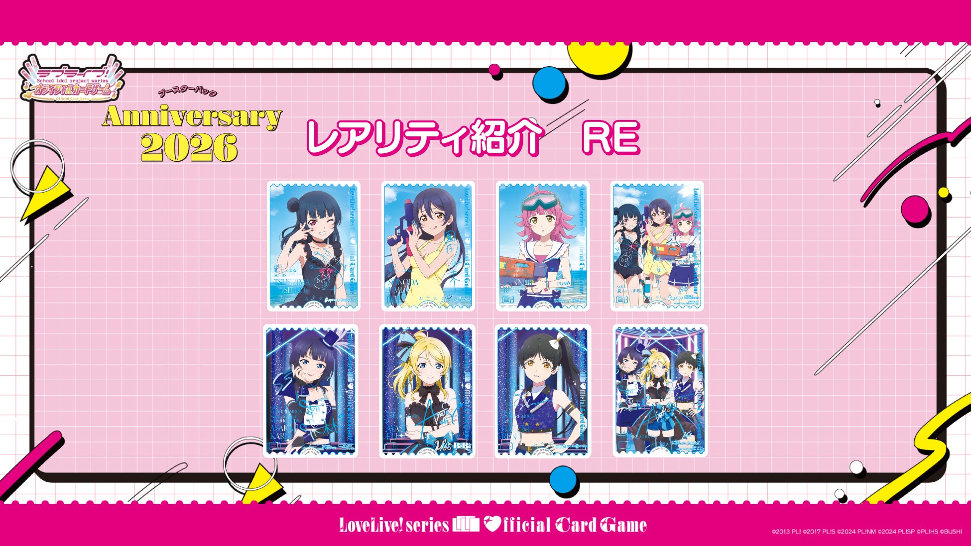 株式会社ブシロード(本社:東京都中野区、代表取締役社長:木谷高明)は、「ラブライブ!シリーズ オフィシャルカードゲーム(以下ラブカ)」から、「ブースターパック Anniversary 2026」と「スタートデッキ ラブライブ!サンシャイン!!」、「スタートデッキ ラブライブ!蓮ノ空女学院スクールアイドルクラブ」を本日2月28日(土)より発売いたしました。あわせて、本商品に収録される注目カード情報をお知らせいたします。またラブカ公式Xにて、「ブースターパック Anniversary 2026」の発売を記念したキャンペーンを開催しております。