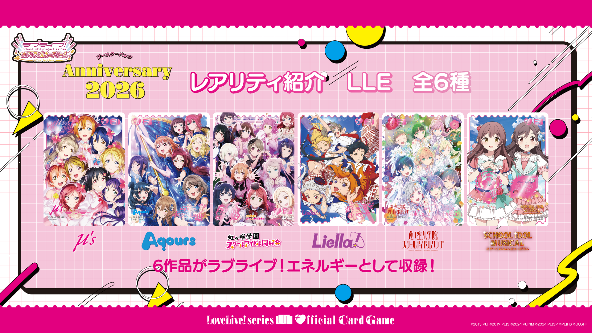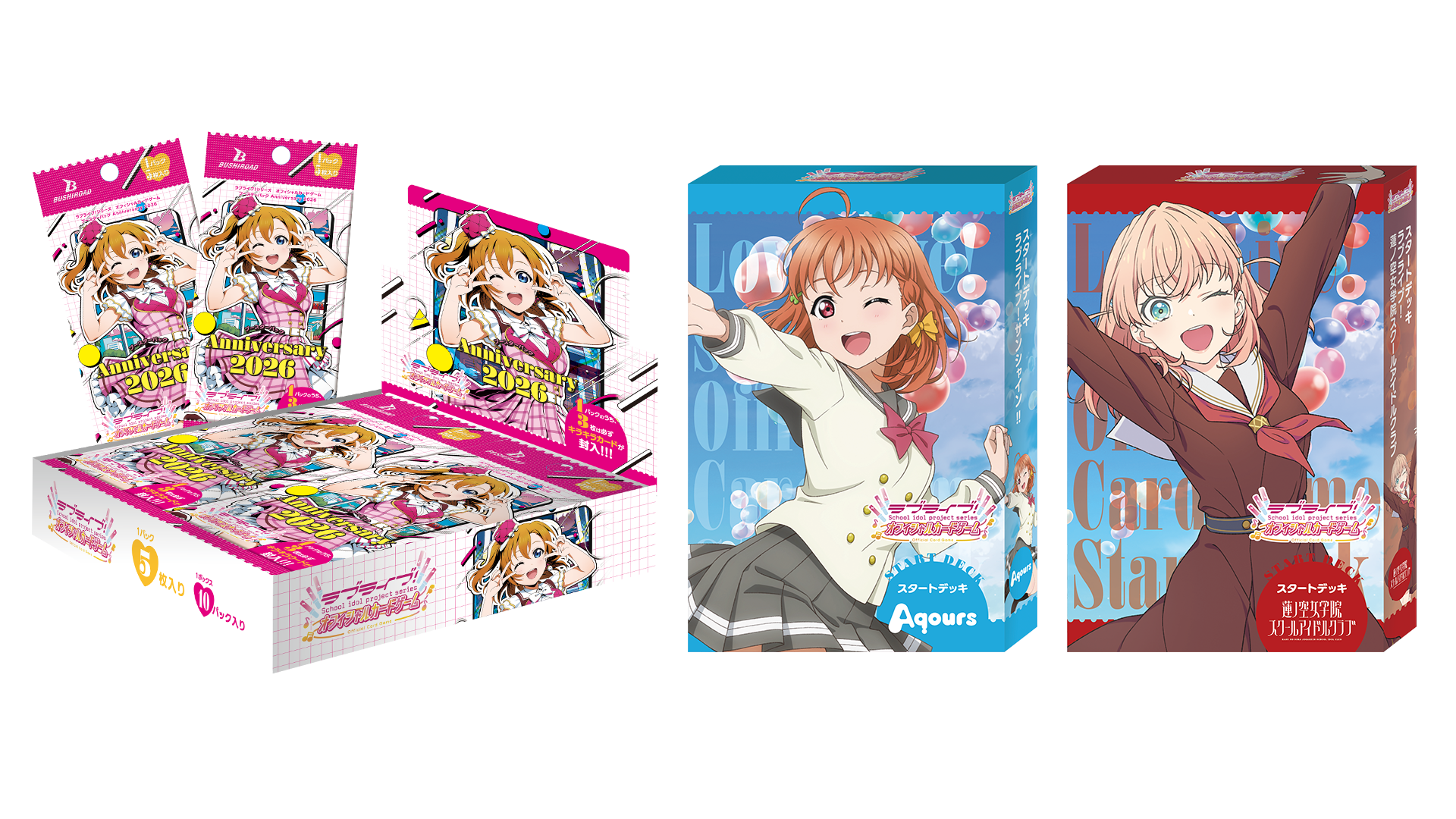 株式会社ブシロード(本社:東京都中野区、代表取締役社長:木谷高明)は、「ラブライブ!シリーズ オフィシャルカードゲーム(以下ラブカ)」から、「ブースターパック Anniversary 2026」と「スタートデッキ ラブライブ!サンシャイン!!」、「スタートデッキ ラブライブ!蓮ノ空女学院スクールアイドルクラブ」を本日2月28日(土)より発売いたしました。あわせて、本商品に収録される注目カード情報をお知らせいたします。またラブカ公式Xにて、「ブースターパック Anniversary 2026」の発売を記念したキャンペーンを開催しております。