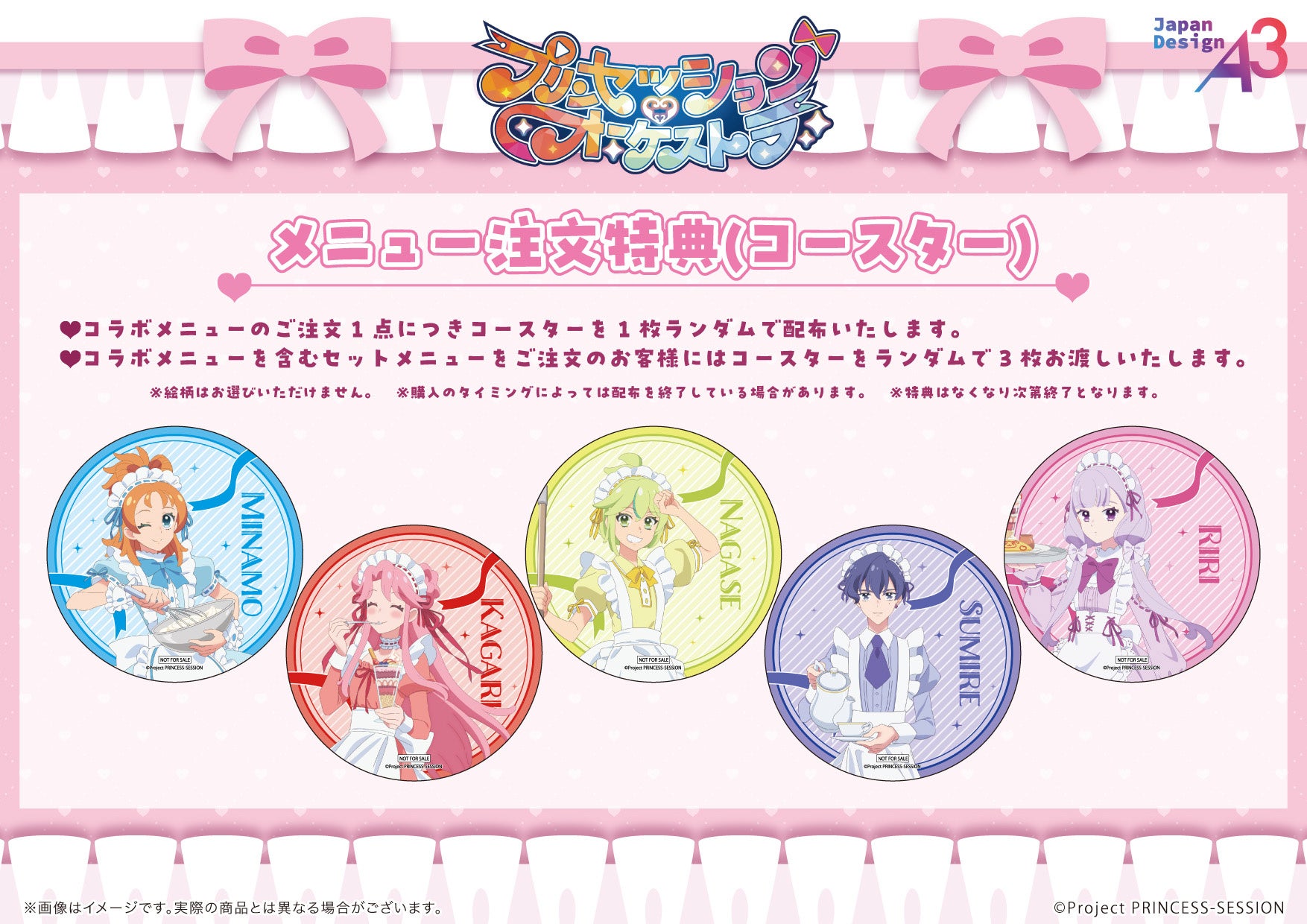 さらに、コラボメニューのご注文1点で1枚、コラボメニューを含むセットメニューのご注文で3枚、ランダムでコースターもプレゼント。