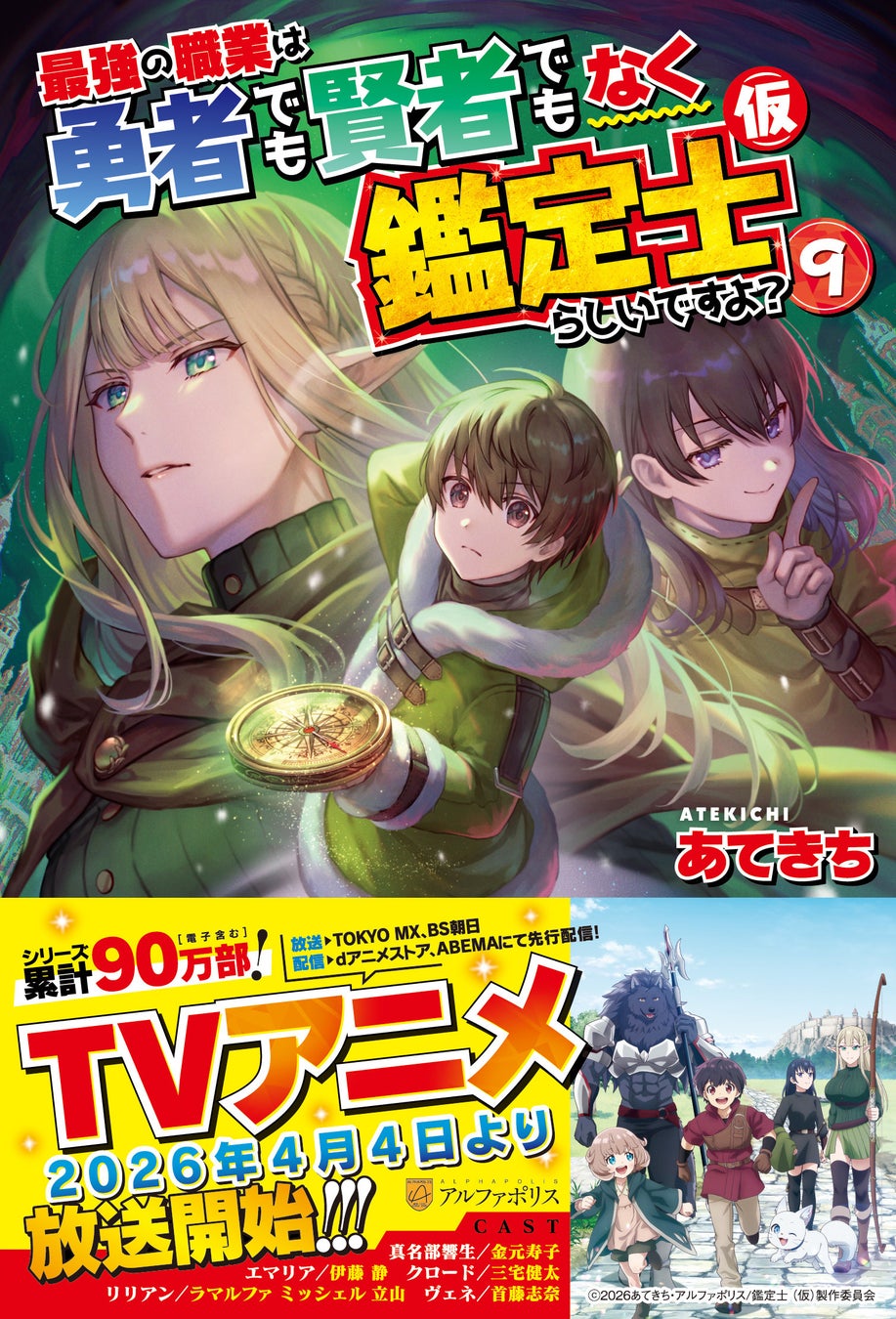 株式会社アルファポリス(本社:東京都渋谷区、代表取締役社長:梶本雄介、https://www.alphapolis.co.jp/)のシリーズ累計100万部(漫画、電子含む)を数える大ヒット小説『最強の職業は勇者でも賢者でもなく鑑定士(仮)らしいですよ?』。そのTVアニメーションが、2026年4月4日(土)22:00~TOKYO MX、BS朝日、AT-Xにて放送されることが発表されました! また、放送に先駆けて4月1日(水)よりdアニメストア、ABEMAでの先行配信も決定! さらに、追加発表の個性豊かなキャラクターが登場するPV第2弾が公開! くわえて、原作小説&コミカライズ最新巻を3月16日(月)に同時刊行いたします!