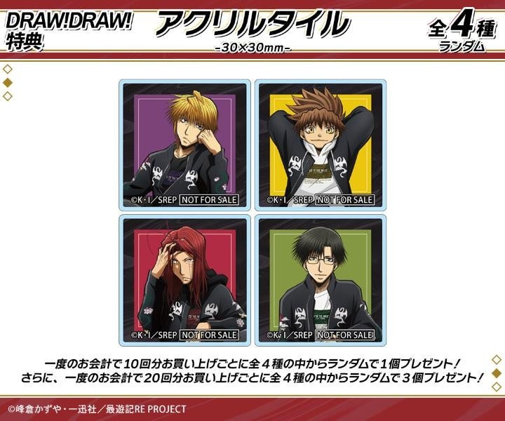 一度のお会計で10回分ご購入ごとに特典アクリルタイル(全4種)の中からランダムで1個、20回分ご購入ごとにランダムで3個プレゼント!