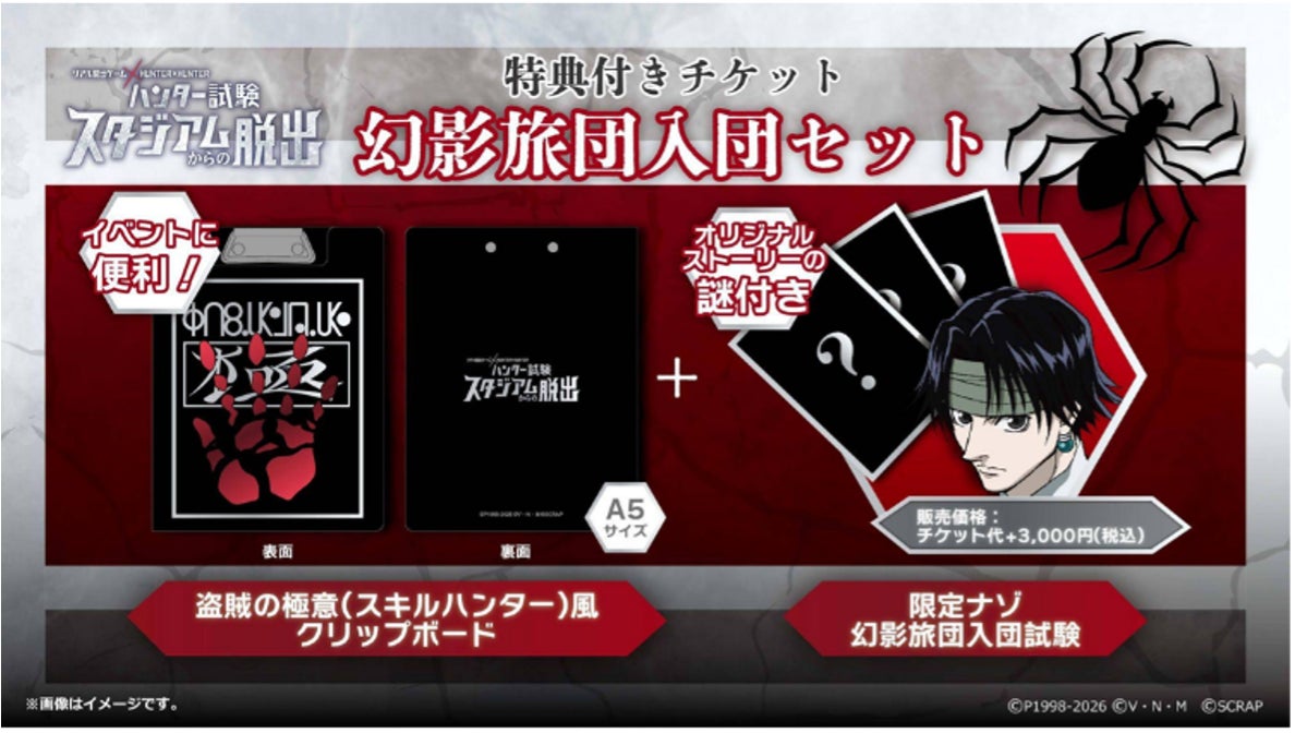 クロロの念能力「盗賊の極意(スキルハンター)」をモチーフにした、オリジナルデザインのクリップボードに、限定謎「幻影旅団入団試験」がセットになった前売チケット購入者限定販売の商品。クリップボード表面には光沢感のある箔押し印刷を採用し、高級感溢れるデザインに仕上がっています。