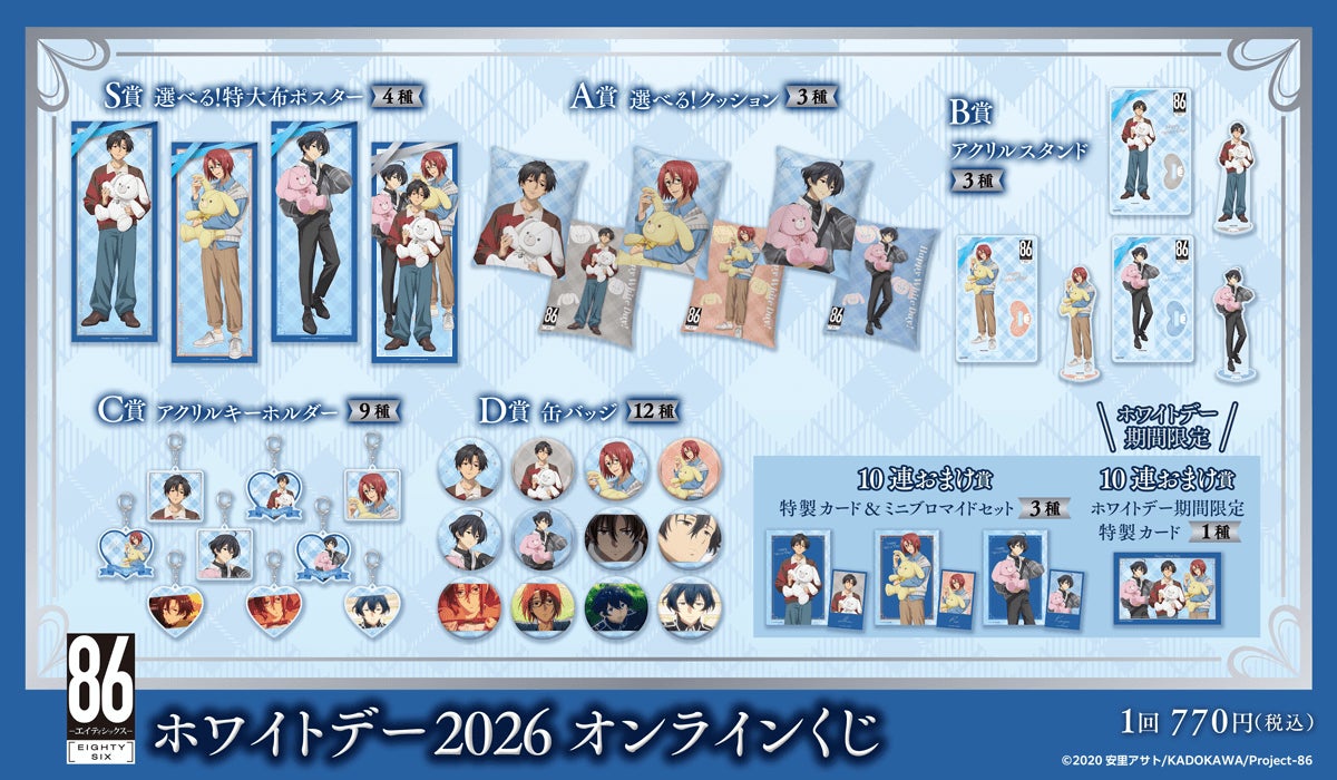 株式会社KADOKAWA(本社:東京都千代田区、取締役 代表執行役社長 CEO:夏野 剛、以下 KADOKAWA)は、運営するオンラインくじサービス「くじ引き堂」において、TVアニメ『86―エイティシックス―』の豪華賞品が手に入る<TVアニメ 「86―エイティシックス―」ホワイトデー2026 オンラインくじ>を、2026年3月12日(木)12時より販売します。