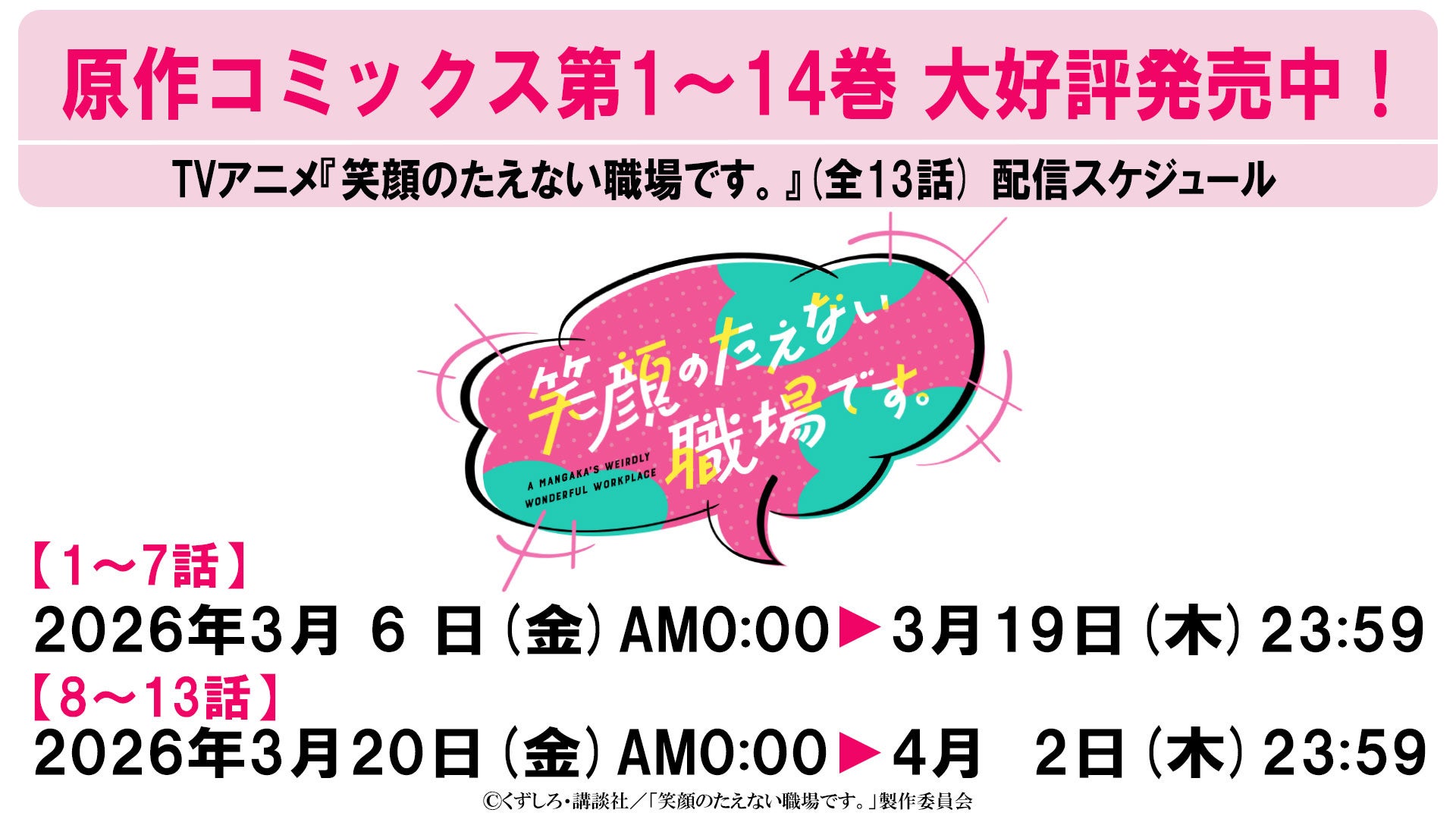 くずしろ先生の大人気マンガ「笑顔のたえない職場です。」を原作とするTVアニメが2025年10月からTOKYO MXほかにて放送され、12月末に最終回を迎えました。これを記念して、講談社が運営するYouTubeチャンネル「フル☆アニメTV」にて、TVアニメ「笑顔のたえない職場です。」全13話を順次無料配信いたします。【第1話~第7話】を本日3月6日から3月19日まで、【第8話~第13話】を3月20日から4月2日までの期間限定配信となりますので、ぜひ原作コミックスと一緒にお楽しみください!
