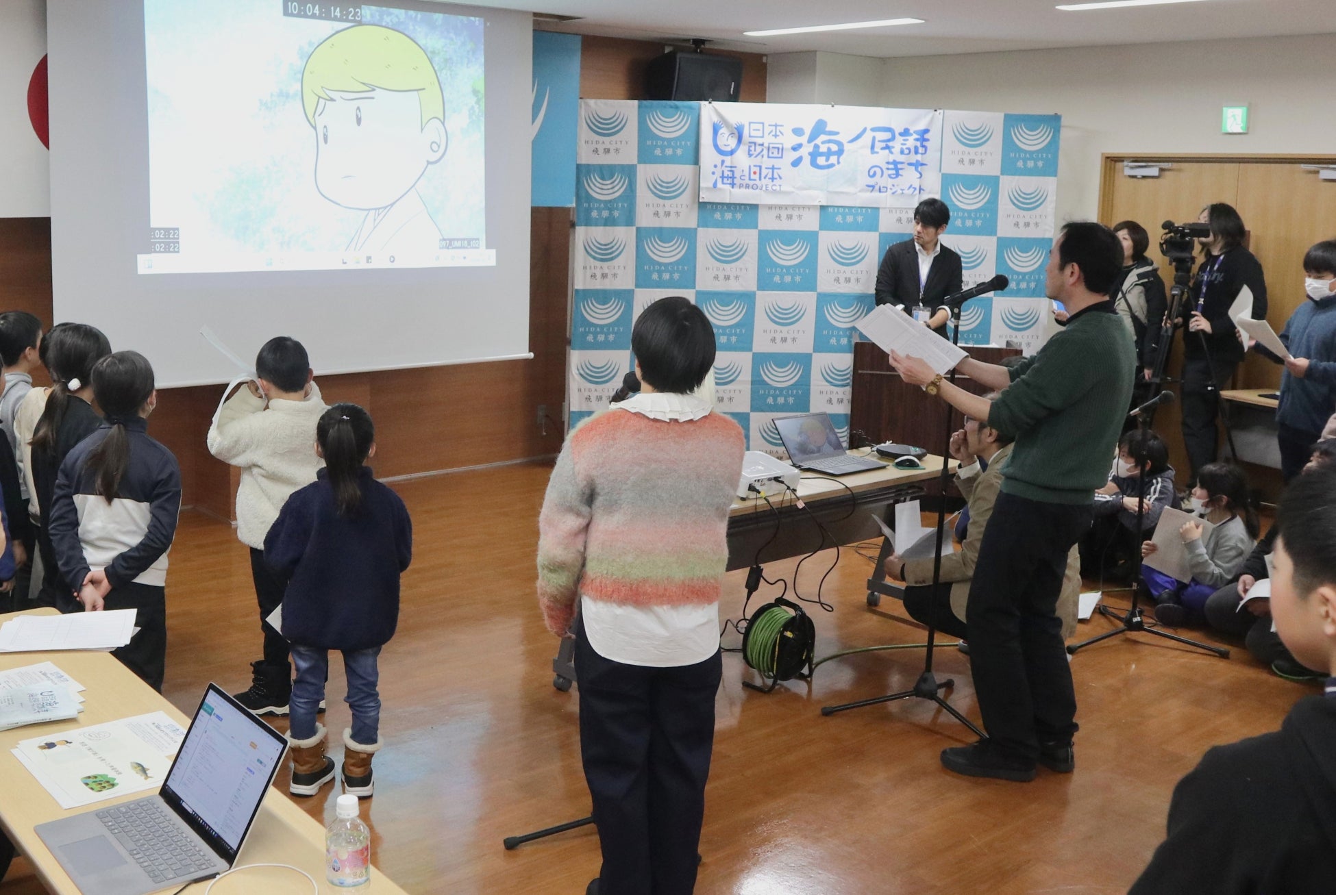 完成報告会後には、飛騨まんが王国で毎年夏に合宿している賢プロダクションから当アニメでキャストを務めた声優・四宮豪さんと冨田泰代さんを講師に、宮川小学校・河合小学校の児童を対象に声優体験ワークショップを実施。