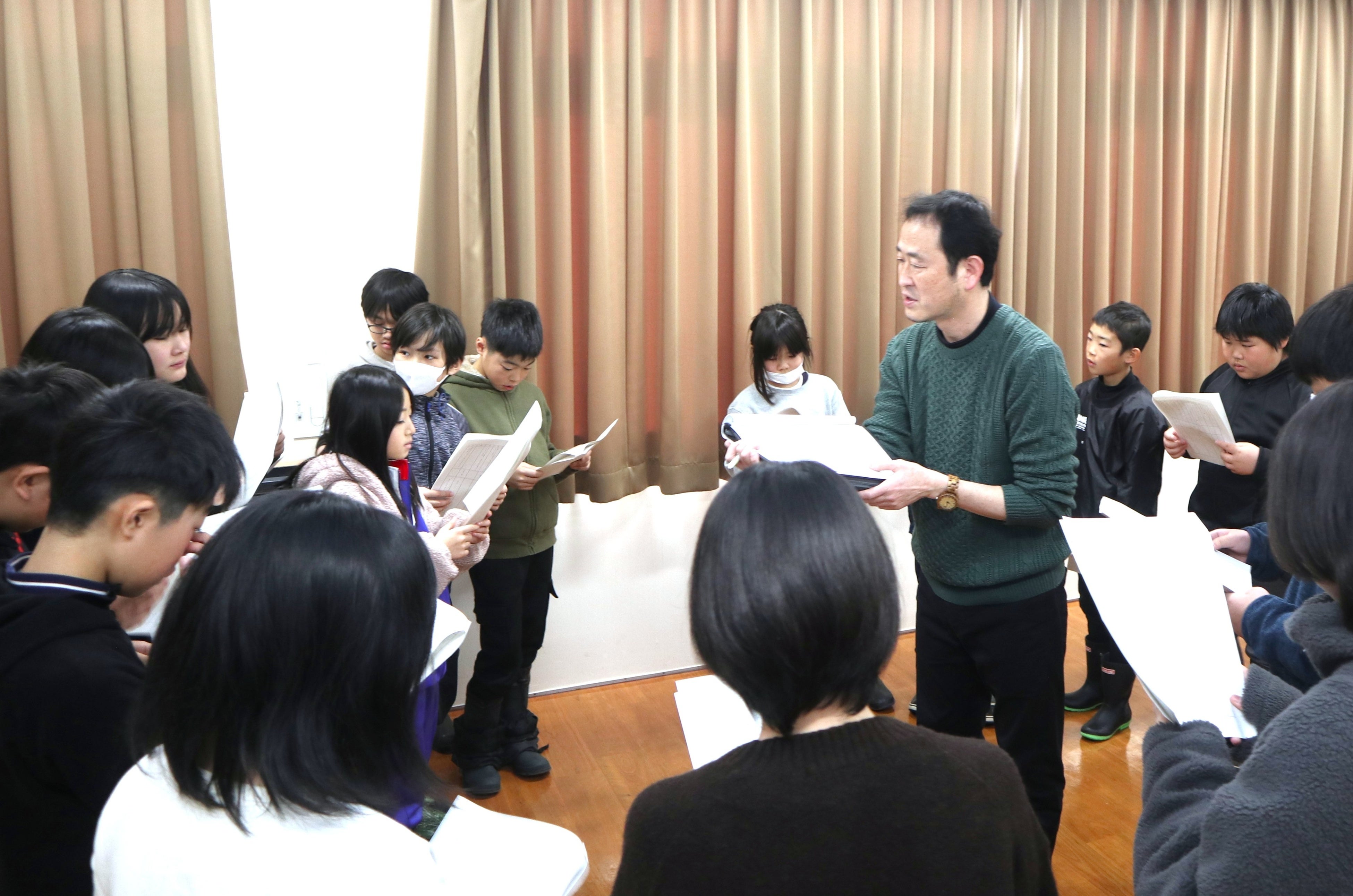 完成報告会後には、飛騨まんが王国で毎年夏に合宿している賢プロダクションから当アニメでキャストを務めた声優・四宮豪さんと冨田泰代さんを講師に、宮川小学校・河合小学校の児童を対象に声優体験ワークショップを実施。