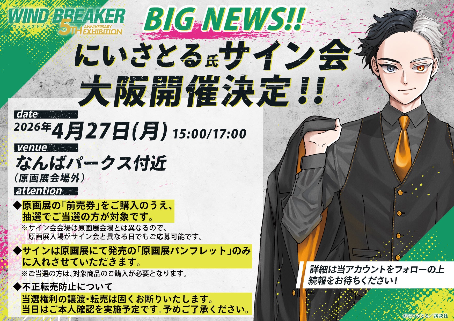2026年3月27日(金)より東京・池袋サンシャインシティ展示ホールAにて開催される、にいさとる氏による大人気コミックス『WIND BREAKER』の連載開始5周年を記念した、作品史上最大規模の原画展「WIND BREAKER 5th ANNIVERSARY EXHIBITION」。