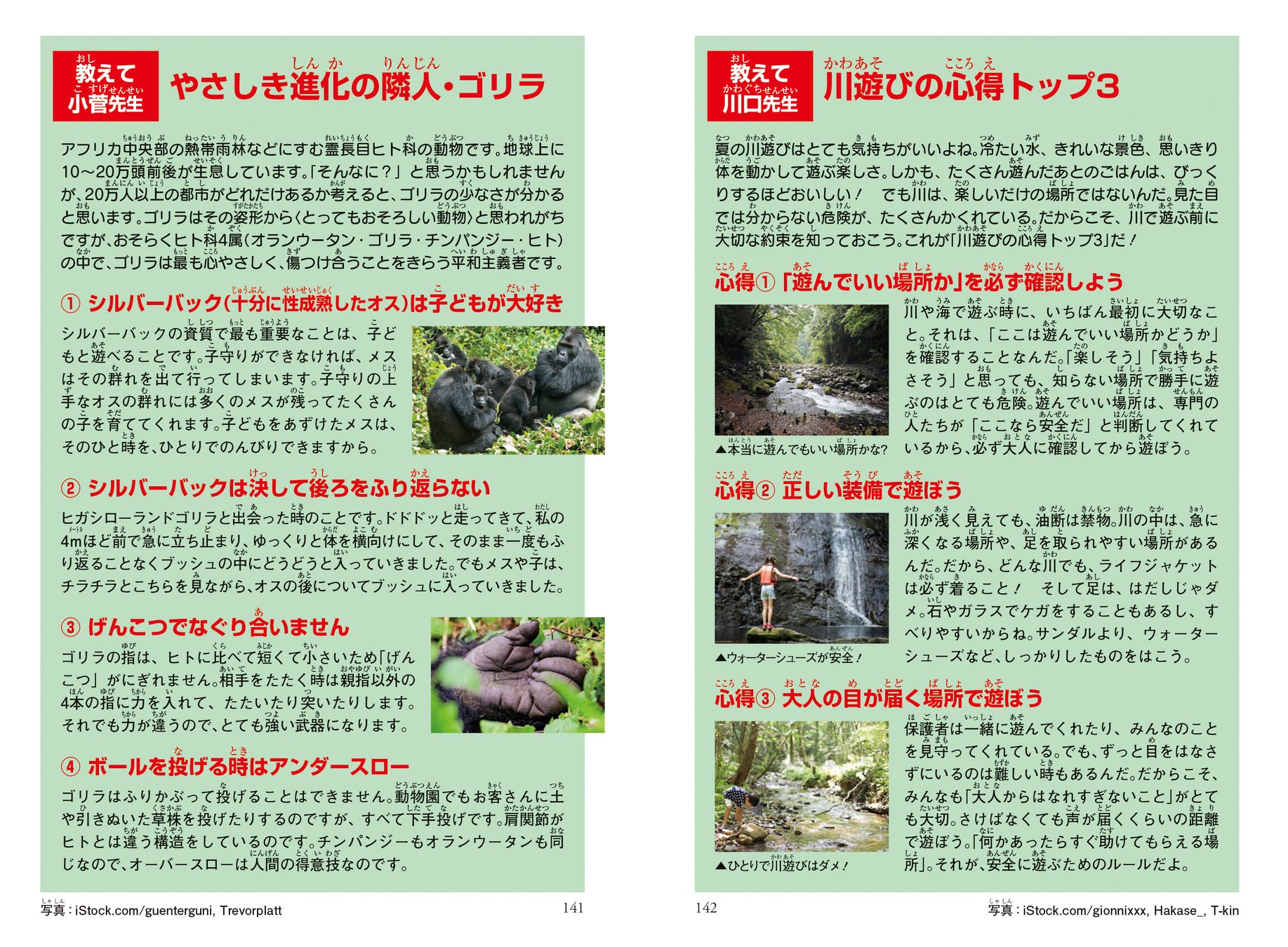 旭川市旭山動物園元園長で獣医師でもある小菅正夫氏と、自然学校「WILD AND NATIVE」を主宰する川口拓氏が監修を務めます。興味深いゴリラの本来の生態や、身近でありながらも危険な川遊びの注意点など、実際に役に立つ情報を収録しております。
