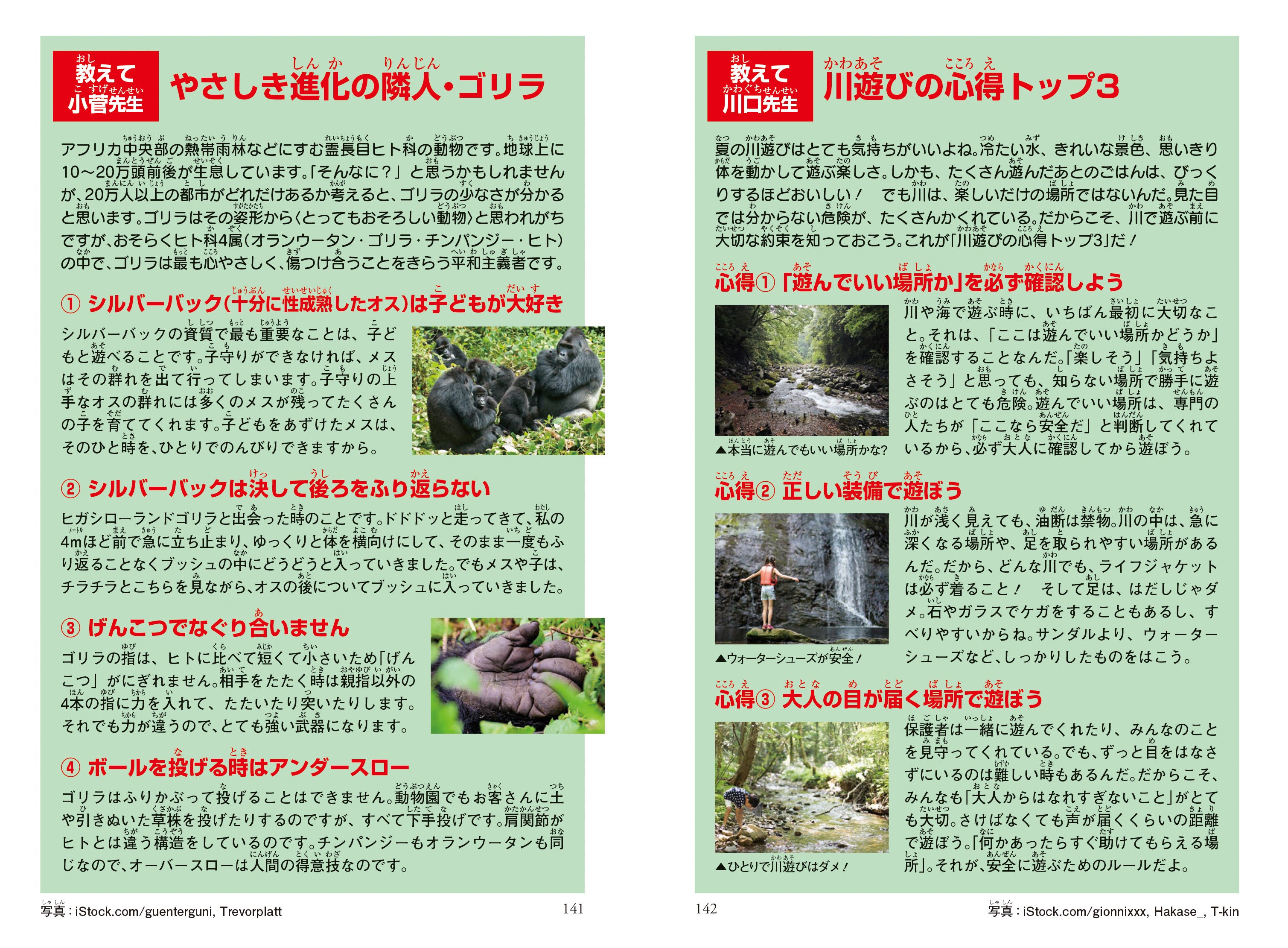 旭川市旭山動物園元園長で獣医師でもある小菅正夫氏と、自然学校「WILD AND NATIVE」を主宰する川口拓氏が監修を務めます。興味深いゴリラの本来の生態や、身近でありながらも危険な川遊びの注意点など、実際に役に立つ情報を収録しております。