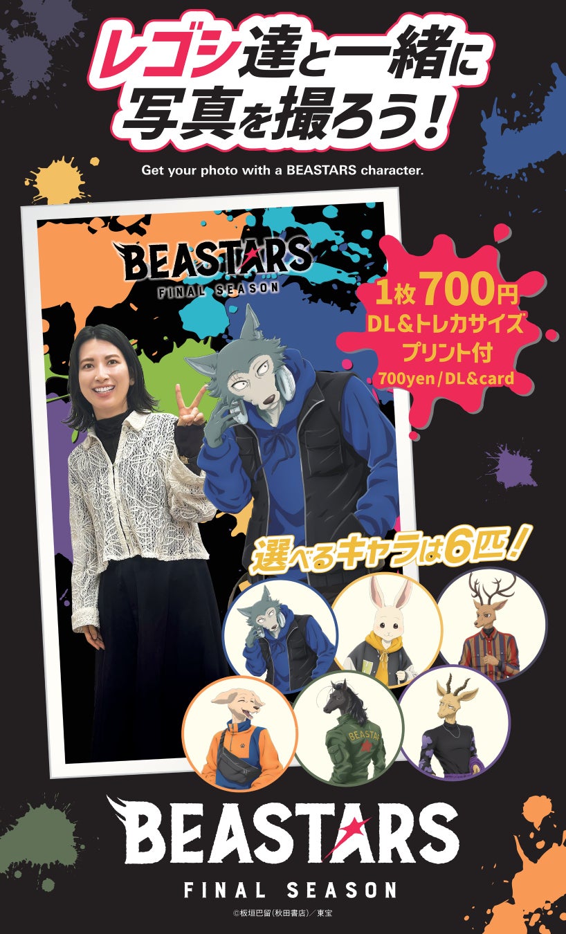 自分で選んだキャラクターやアーティストがその場にいるかのように登場し、臨場感のある撮影体験ができるTOPPANのサービス「WithShot®」を活用したデジタルフォトブースです。『BEASTARS FINAL SEASON』に登場するキャラクターと一緒にいるような写真を撮ることができ、「TOPPA!!! BASE AKIBA」ならではの特別な体験を提供します。