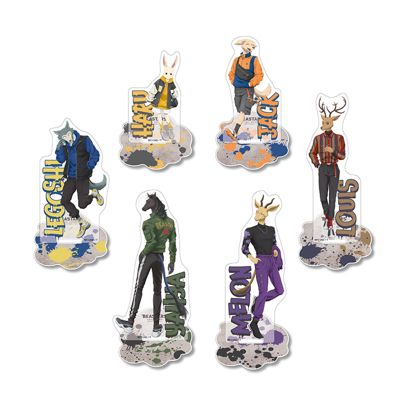 「TOPPA!!! BASE AKIBA」オリジナルのアクリルスタンドです。ストリートファッションをコンセプトに、作品内に登場するキャラクター「レゴシ」「ハル」「ルイ」「ジャック」「ヤフヤ」「メロン」を描いたデザインです。