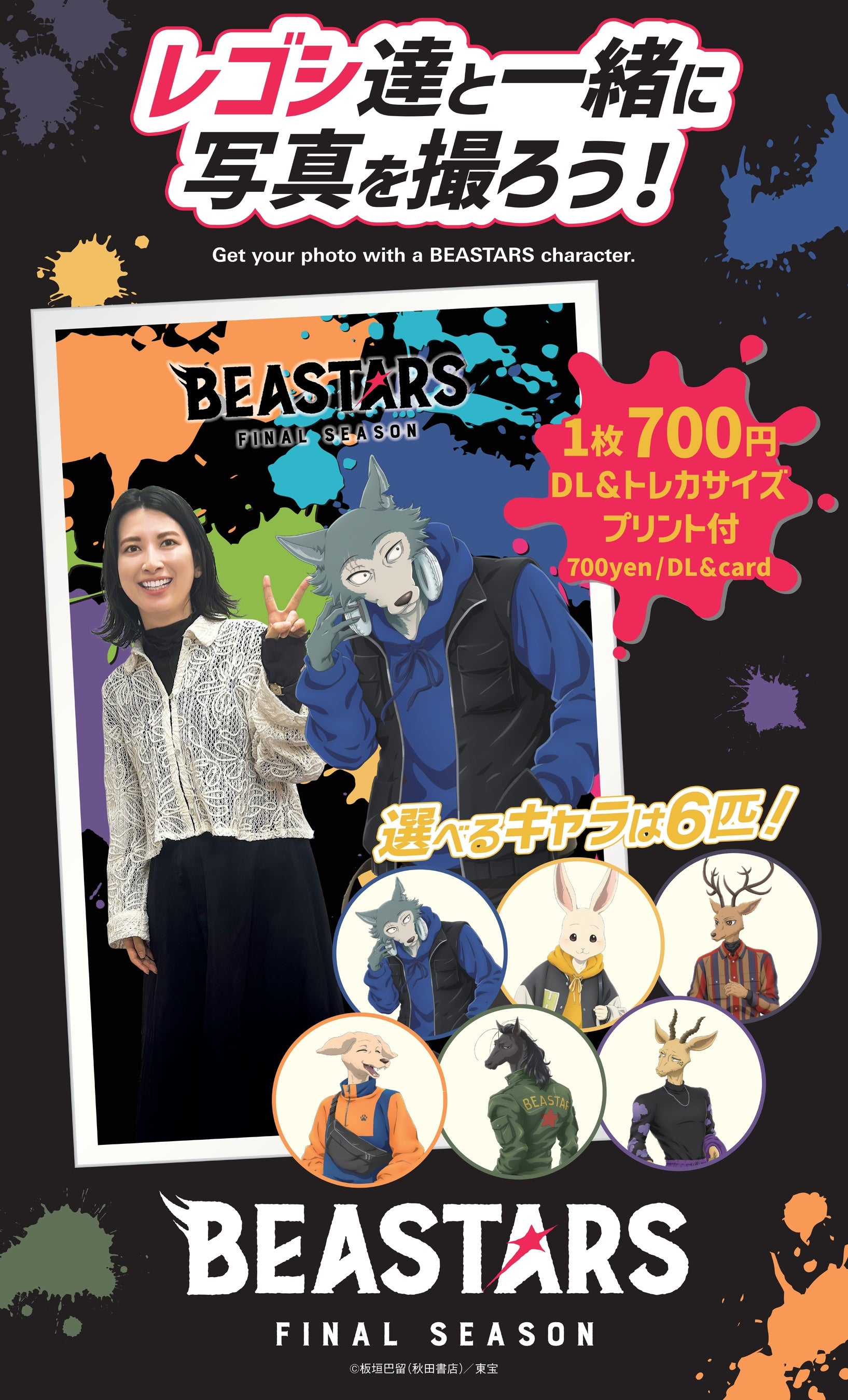 自分で選んだキャラクターやアーティストがその場にいるかのように登場し、臨場感のある撮影体験ができるTOPPANのサービス「WithShot®」を活用したデジタルフォトブースです。『BEASTARS FINAL SEASON』に登場するキャラクターと一緒にいるような写真を撮ることができ、「TOPPA!!! BASE AKIBA」ならではの特別な体験を提供します。