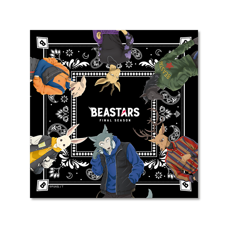 「TOPPA!!! BASE AKIBA」オリジナルのバンダナです。52cm×52cmの黒地のバンダナで、6匹のキャラクターが、中央に配置された『BEASTARS FINAL SEASON』ロゴを囲むようにデザインされています。飾ったり、ファッションとして身に付けたりして日常使いもできるアイテムです。