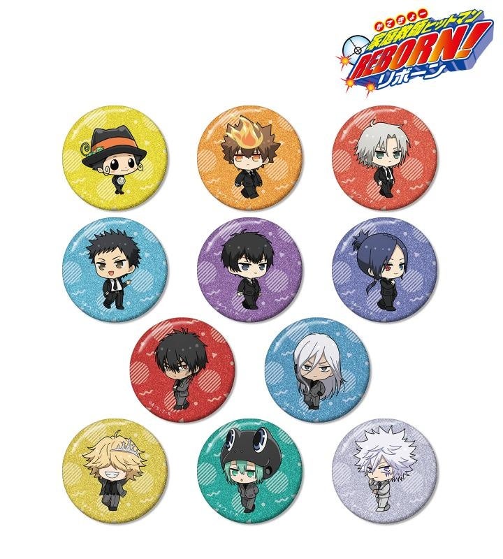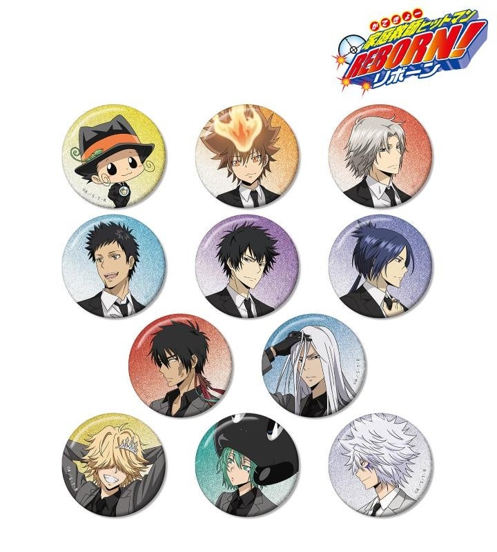 リボーン、沢田 綱吉、獄寺 隼人、山本 武、雲雀 恭弥、六道 骸、笹川 了平、大人ランボのイラストを新たなタッチで魅力的に表現し、グリッター加工を施した缶バッジに仕上げました。