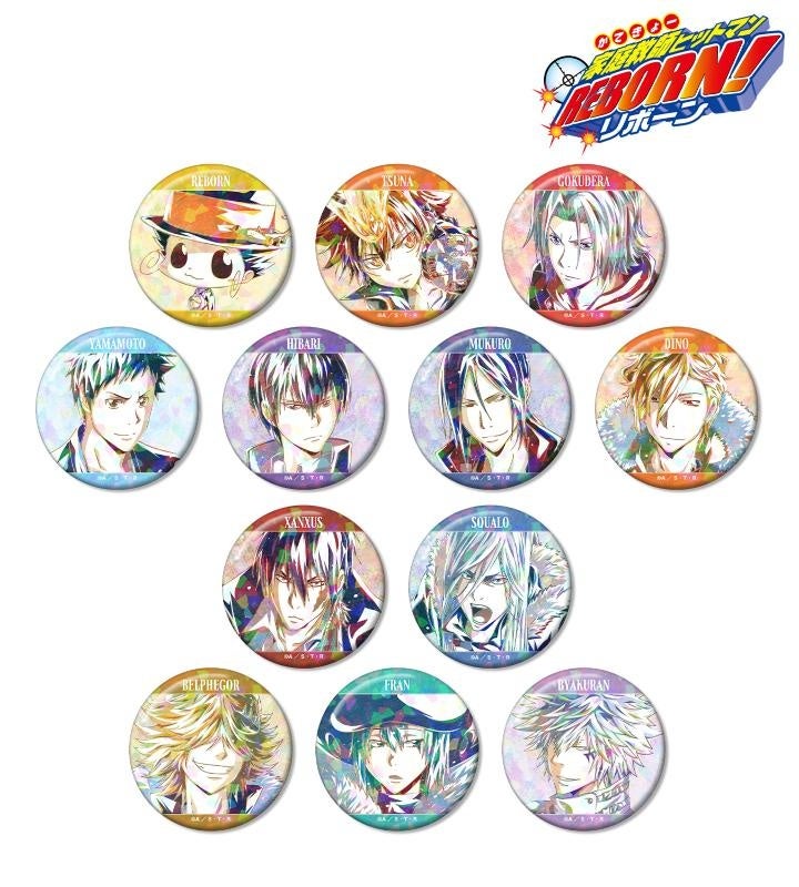 リボーン、沢田 綱吉、獄寺 隼人、山本 武、雲雀 恭弥、六道 骸(10年後)、ディーノ(10年後)、XANXUS(10年後)、スペルビ・スクアーロ(10年後)、ベルフェゴール(10年後)、フラン、白蘭のイラストを新たなタッチで魅力的に表現し、ホログラム加工を施した缶バッジに仕上げました。