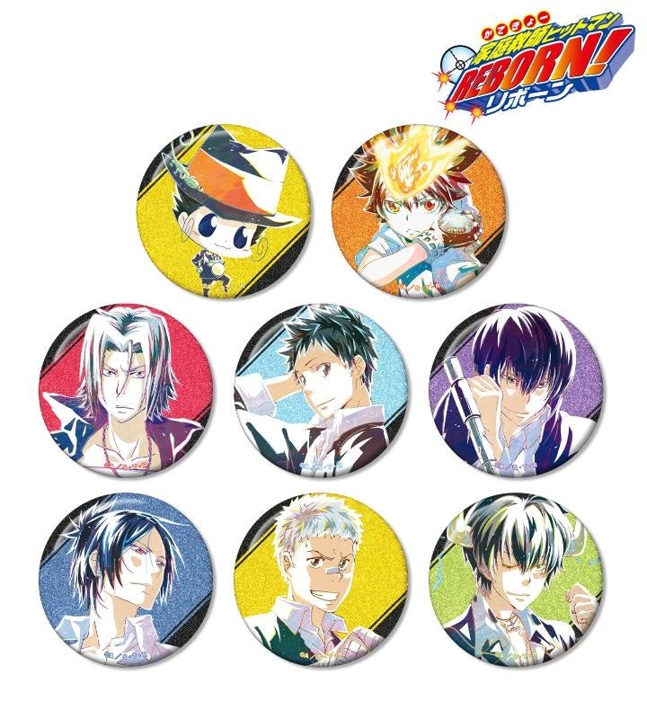 リボーン、沢田 綱吉、獄寺 隼人、山本 武、雲雀 恭弥、六道 骸、笹川 了平、大人ランボのイラストを新たなタッチで魅力的に表現し、グリッター加工を施した缶バッジに仕上げました。