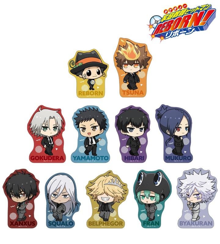 リボーン、沢田 綱吉、獄寺 隼人(10年後)、山本 武(10年後)、雲雀 恭弥(10年後)、六道 骸(10年後)、XANXUS(10年後)、スペルビ・スクアーロ(10年後)、ベルフェゴール(10年後)、フラン、白蘭の描き起こしちびキャライラストをメインにデザインし、アクリルスタンドに仕上げました。