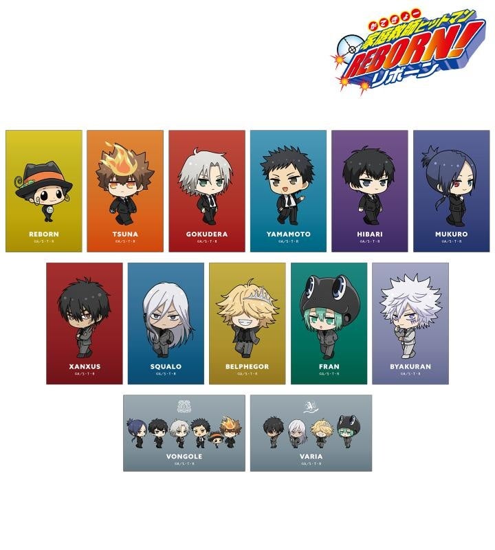 リボーン、沢田 綱吉、獄寺 隼人(10年後)、山本 武(10年後)、雲雀 恭弥(10年後)、六道 骸(10年後)、XANXUS(10年後)、スペルビ・スクアーロ(10年後)、ベルフェゴール(10年後)、フラン、白蘭の描き起こしちびキャライラストをメインにデザインし、イラストカードに仕上げました。