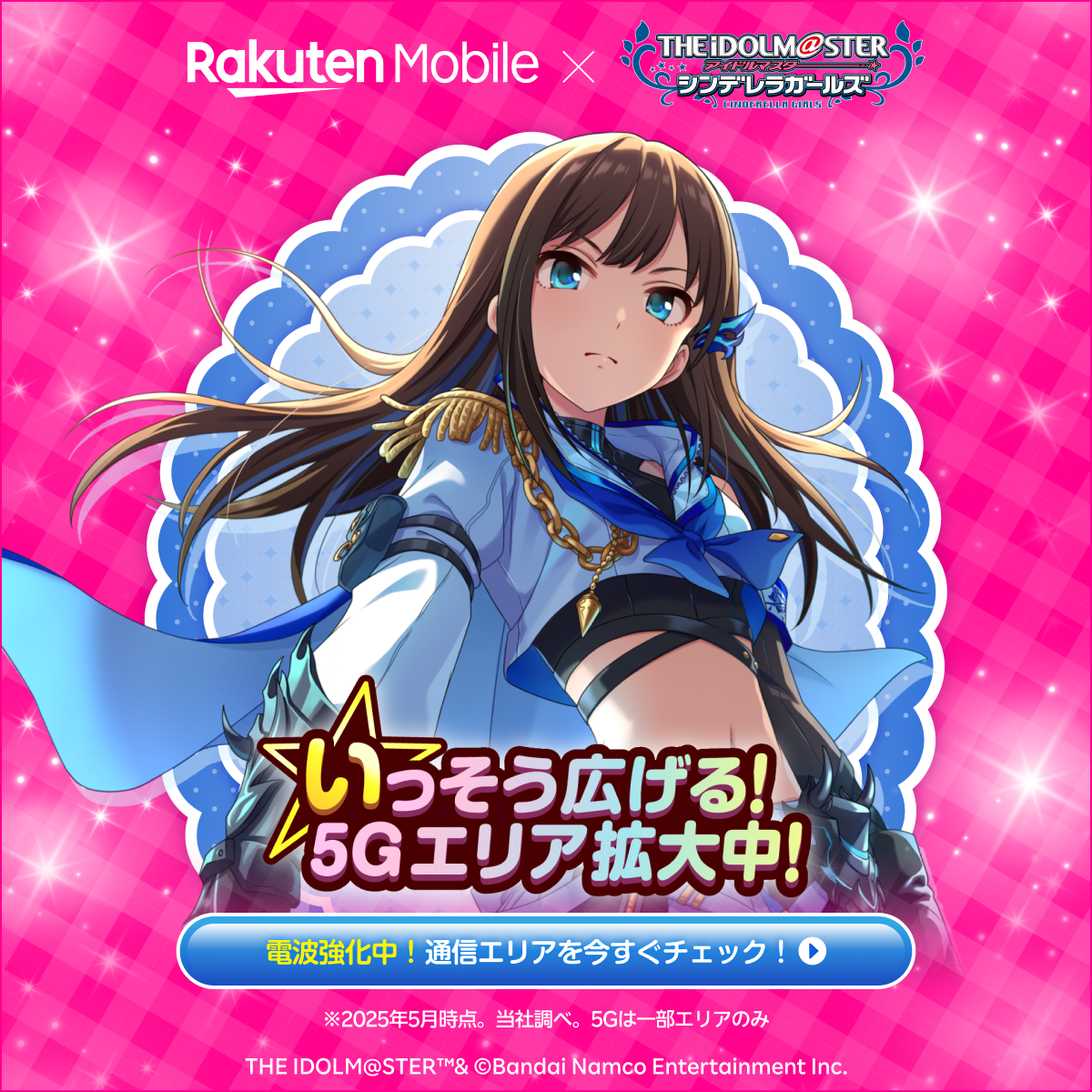 実施内容: 「アイドルマスター シンデレラガールズ」に登場する総勢46名のアイドルが「楽天モバイル」の広告に登場し、「あ」から「ん」までのひらがな50音から始まるメッセージが入ったPR広告をウェブ上で展開