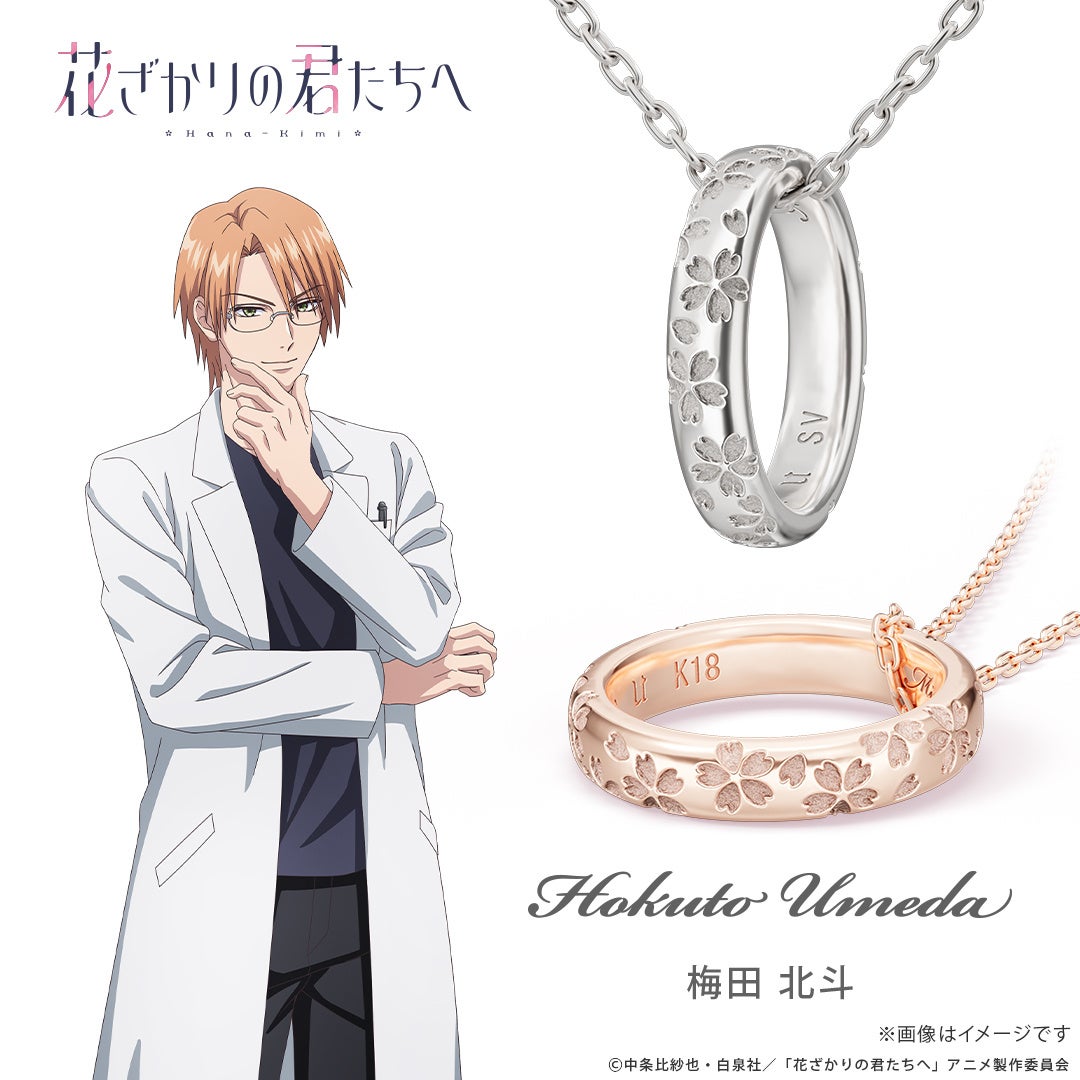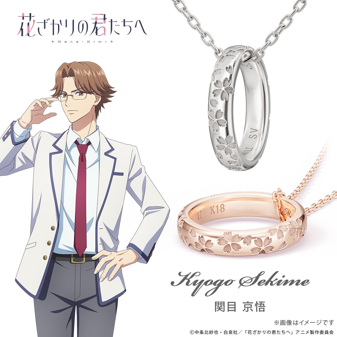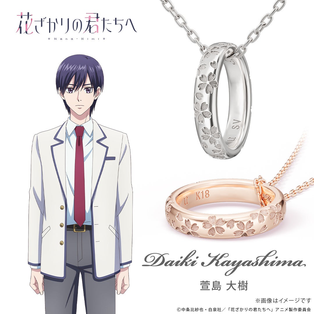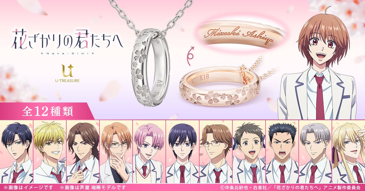 このたびの新作は、アニメ「花ざかりの君たちへ」の作品ロゴやキービジュアルをイメージしたデザインのリングネックレスです。内側には12名の中から選んだキャラクターの名前を英語で刻印します。