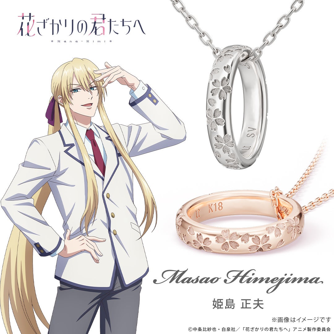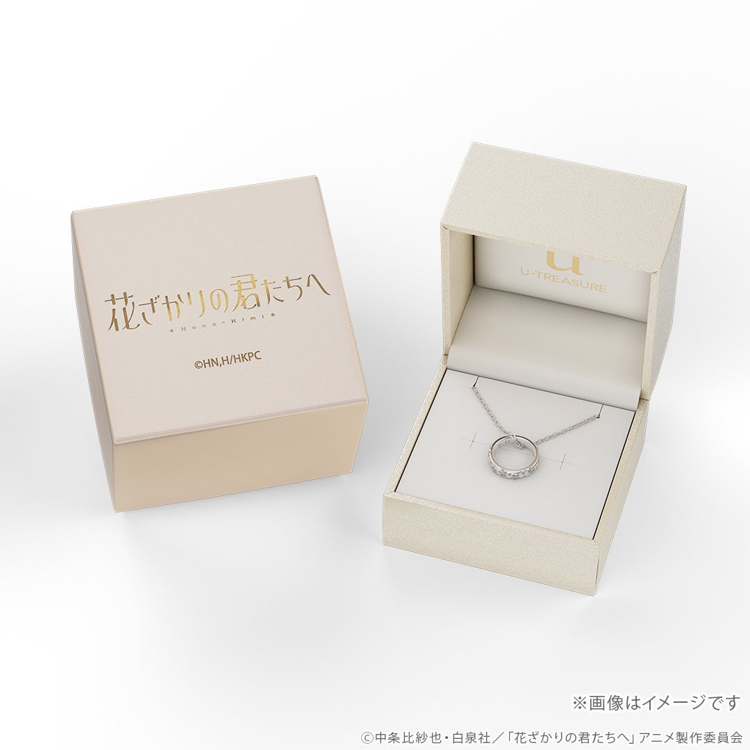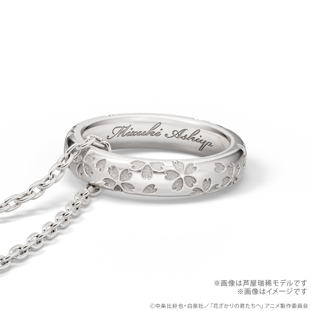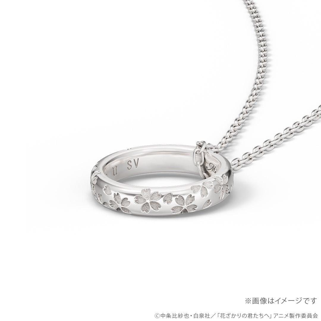 このたびの新作は、アニメ「花ざかりの君たちへ」の作品ロゴやキービジュアルをイメージしたデザインのリングネックレスです。内側には12名の中から選んだキャラクターの名前を英語で刻印します。
