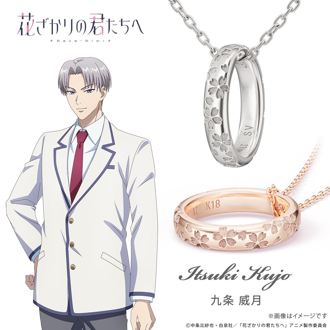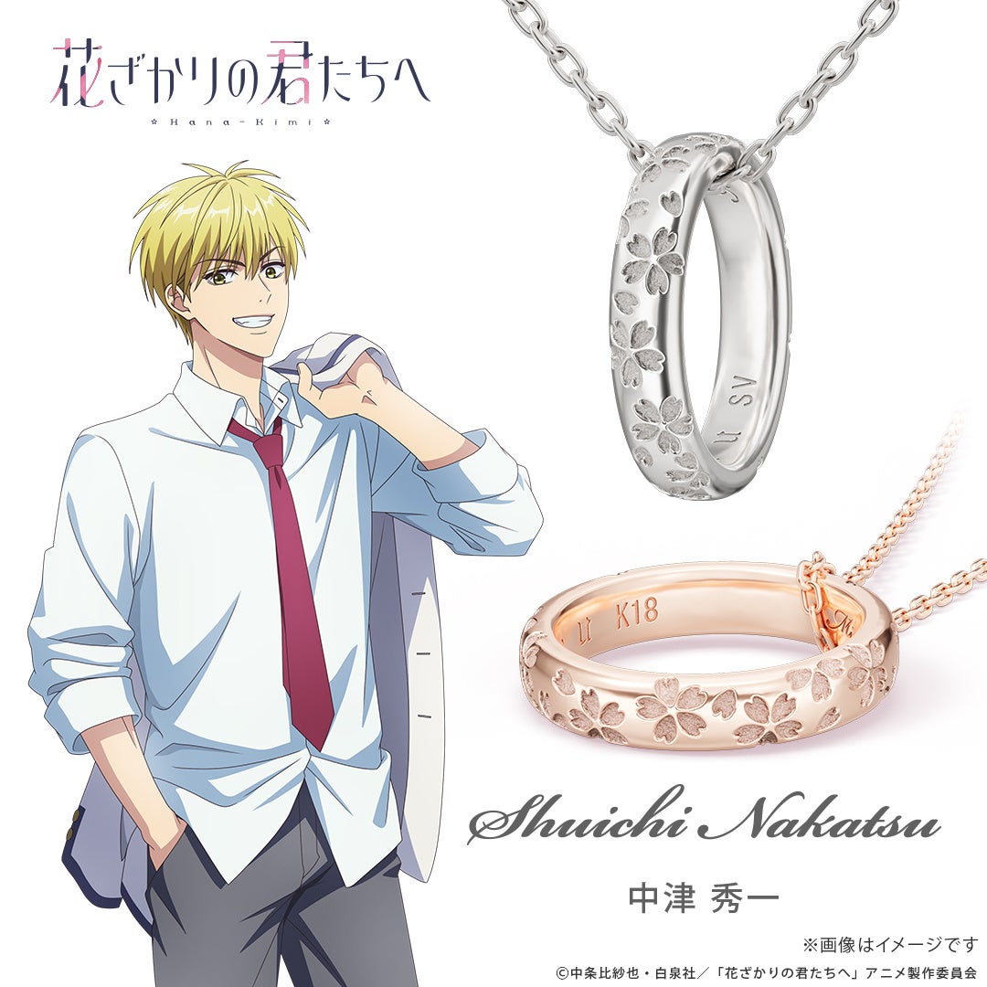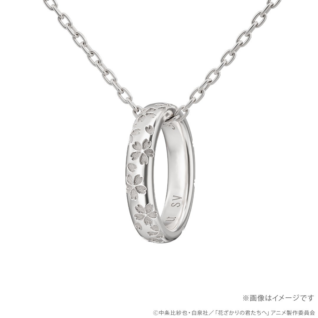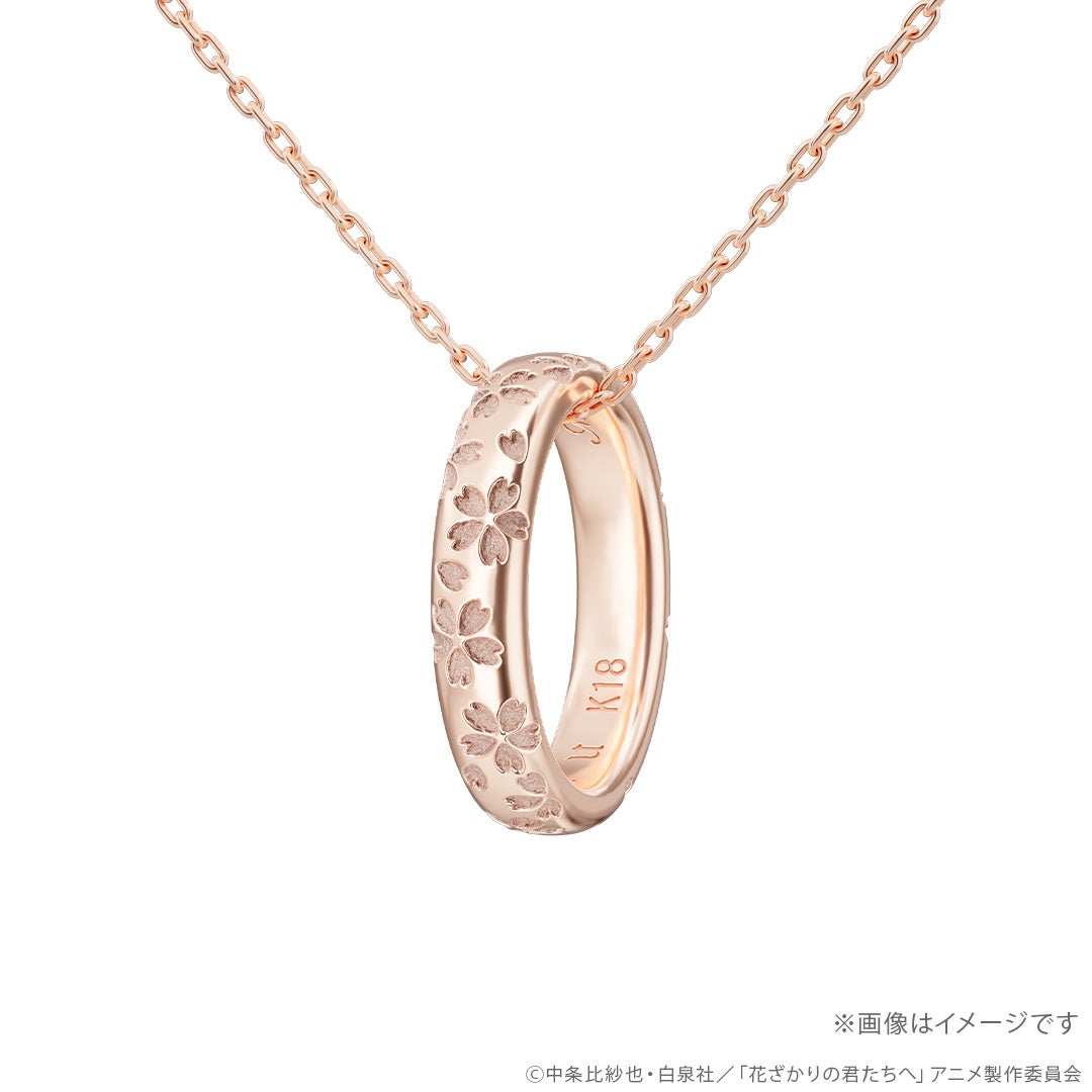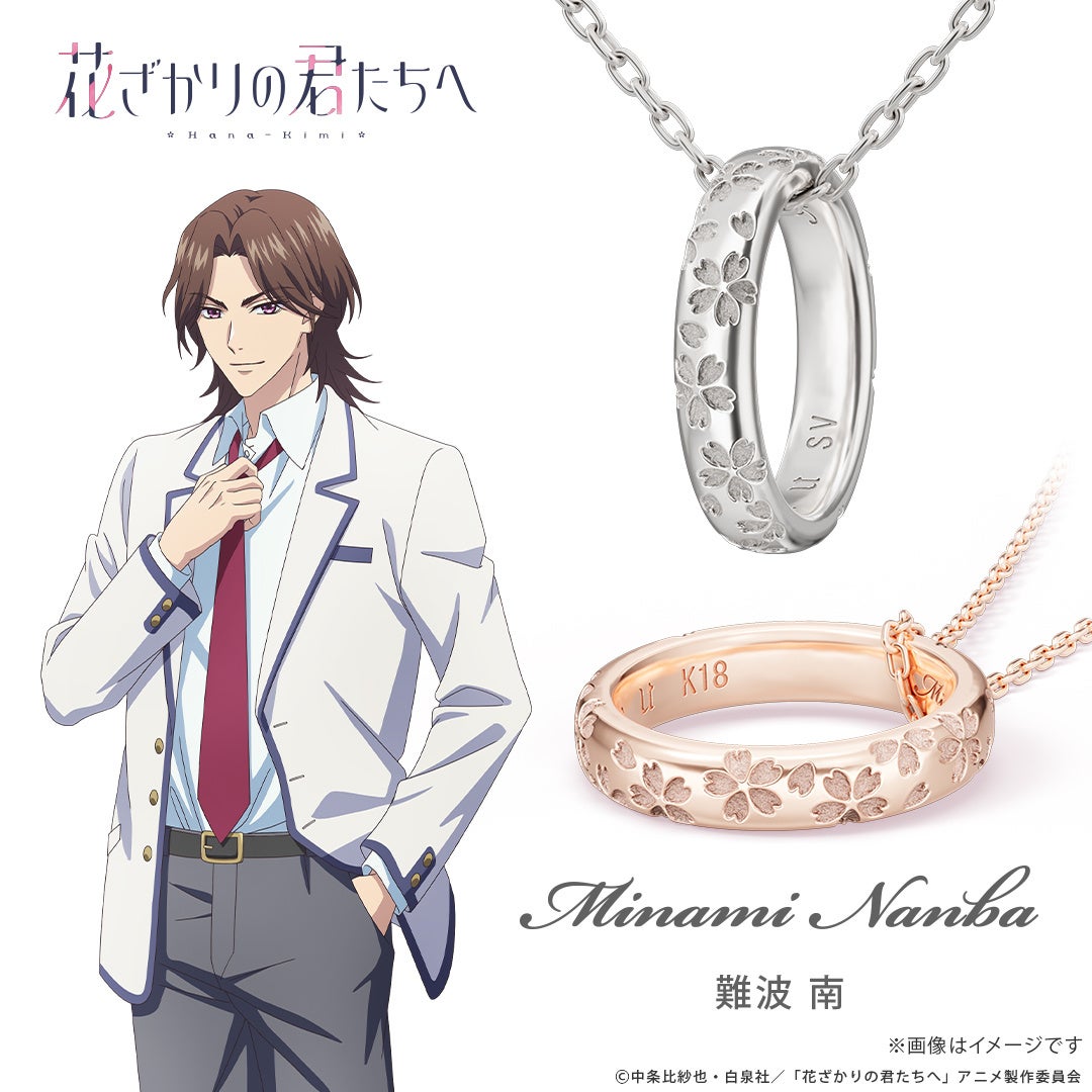 このたびの新作は、アニメ「花ざかりの君たちへ」の作品ロゴやキービジュアルをイメージしたデザインのリングネックレスです。内側には12名の中から選んだキャラクターの名前を英語で刻印します。