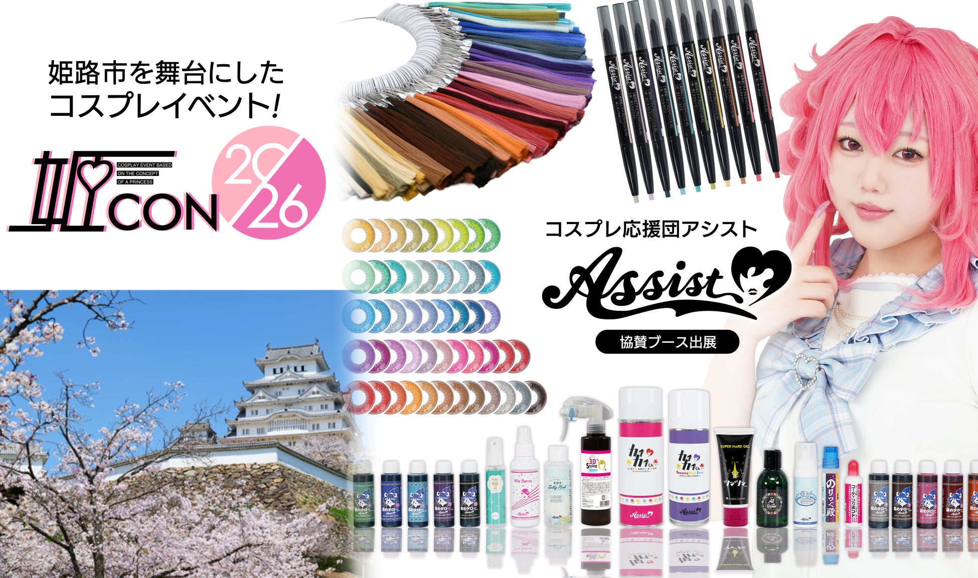 アシストは本イベントに2026年も協賛・出展します。当日はメイン会場のアクリエひめじにアシストブースを設置し、200色以上を展開するコスプレウィッグ「Premium ウィッグ」シリーズの全色展示に加え、人気ウィッグのスタイル展示を実施。他にも、アシストオリジナルデザインのカラーコンタクトや、人気雑貨、コスメを多数展示・販売します。