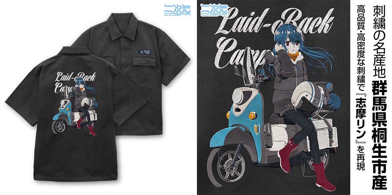 『ゆるキャン△ SEASON3』より、国産高密度刺繍の圧倒的存在感で”志摩リン”の姿を表現した工芸品を身に纏う満足感が味わえる一着「描き下ろし 志摩リン 刺繍ワークシャツ バイクでひといきVer.」をはじめ、「シルエットバイク志摩リン ドライTシャツ」や「カリブー ミニショルダーポーチ」など新グッズが二次元コスパから登場です。
