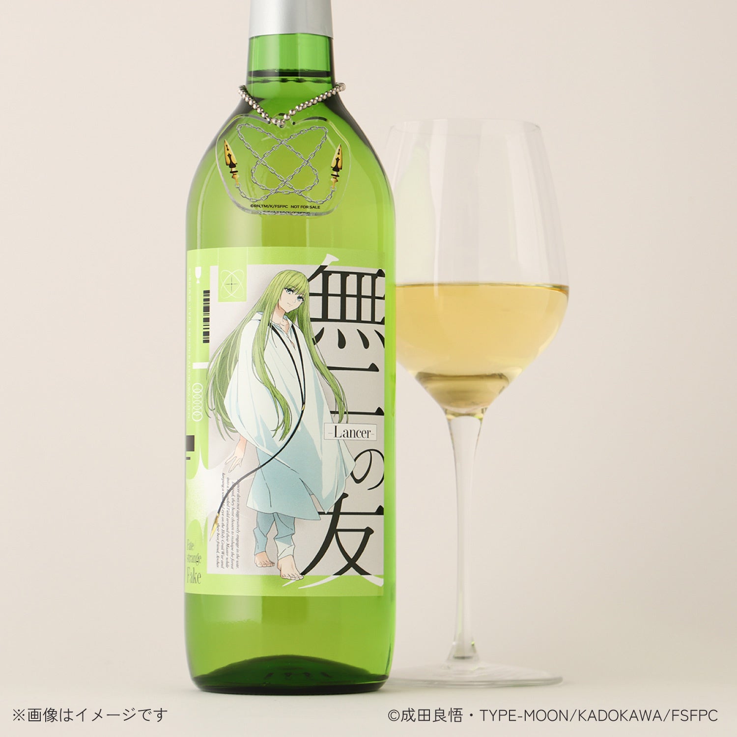 「無二の友 – Lancer-」は、ランサーをイメージしたオリジナルの白ワイン。柑橘やハーブのような爽やかな香りが魅力です。軽やかな飲み心地で、日常のひとときも優雅に彩ってくれる1本です。購入特典として、ランサーの宝具「天の鎖」をデザインしたチャームが付きます。