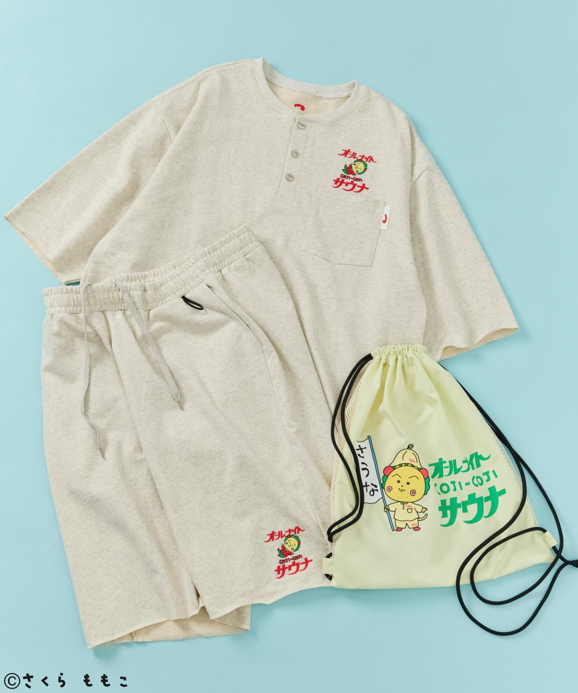 カプセルホテルやスーパー銭湯でよく見られる館内着をイメージしたセットアップ。裏毛素材で、サウナ上がりやルームウェアとして心地よく着られるセットアップです。