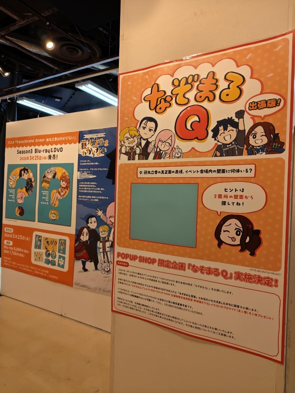 期間中、開催店舗のPOPUPSHOPの会場内 なぞまるQの問題場所にて藤丸の表情を掲示いたします。