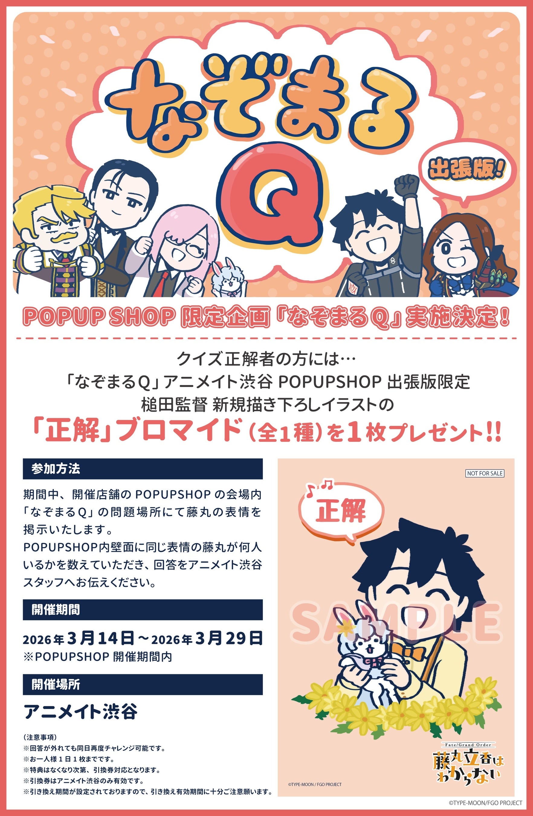 期間中、開催店舗のPOPUPSHOPの会場内 なぞまるQの問題場所にて藤丸の表情を掲示いたします。