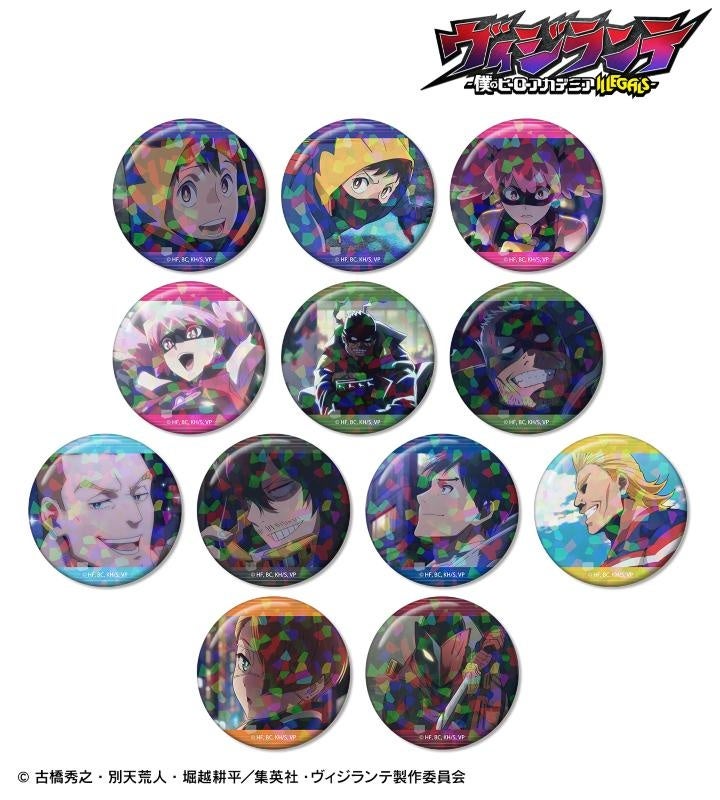灰廻航一、ポップ☆ステップ、ナックルダスター、キャプテン・セレブリティ、イレイザーヘッド、インゲニウム、オールマイト、蜂須賀九印、スタンダールの印象的なシーンをホログラム加工を施した缶バッジに仕上げました。