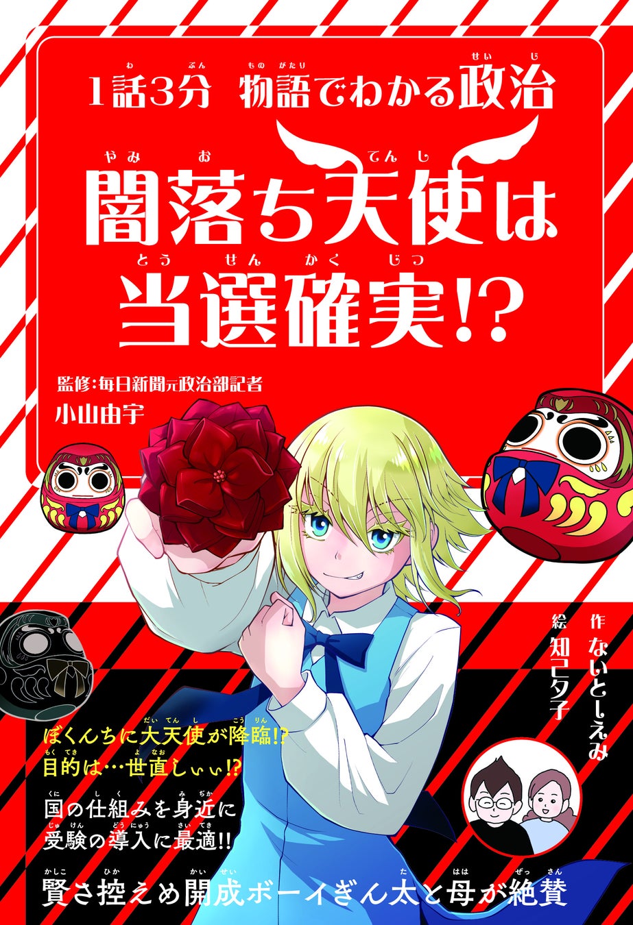 JTBグループで旅行・ライフスタイル情報を提供する株式会社JTBパブリッシング(東京都江東区、代表取締役 社長執行役員:盛崎宏行)は、2026年3月21日(土)に『1話3分 物語でわかる政治 闇落ち天使は当選確実!?』(作:ないとーえみ、絵:知己夕子)を刊行します。本書は小学6年生の男子ミナトと世直しのために降臨した自称「大天使」のキラのおもしろおかしいやりとりを通して、憲法や国会、内閣、予算といった政治に関する事柄を学んでいくスタイルの小説です。1話あたり5ページと短く、また各話の最後に言葉の解説があるので、手軽に学習できるのが特徴です。
