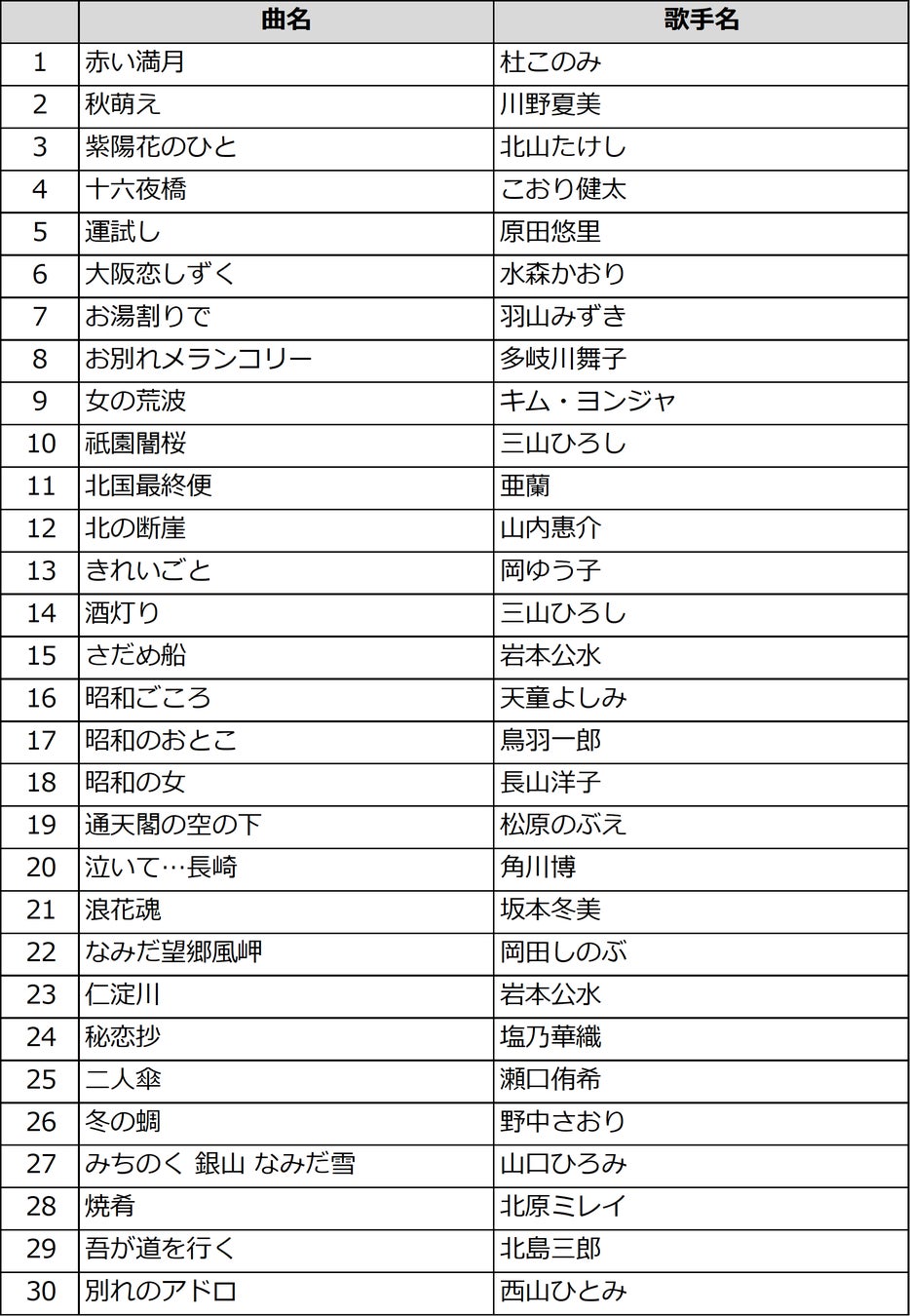 【演歌・歌謡曲部門】カラオケで最も歌われた演歌・歌謡曲が対象