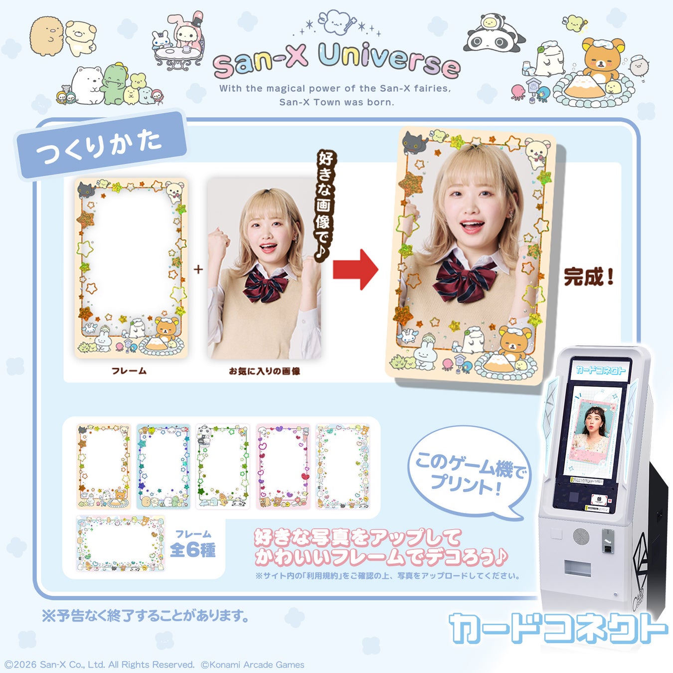 株式会社コナミアーケードゲームスは、アミューズメント施設向けカードプリントゲーム機『カードコネクト』にて、サンエックス株式会社のキャラクターコンテンツ『サンエックスユニバース』とのコラボデザインイベントを3月19日(木)から開催することをお知らせします。