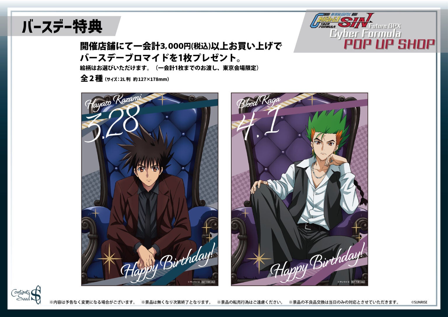 株式会社コンテンツシード(本社:東京都品川区、代表取締役:大塚 則和)は、2026年3月27日(金)より『新世紀GPXサイバーフォーミュラSIN』 POP UP SHOPを開催いたします。