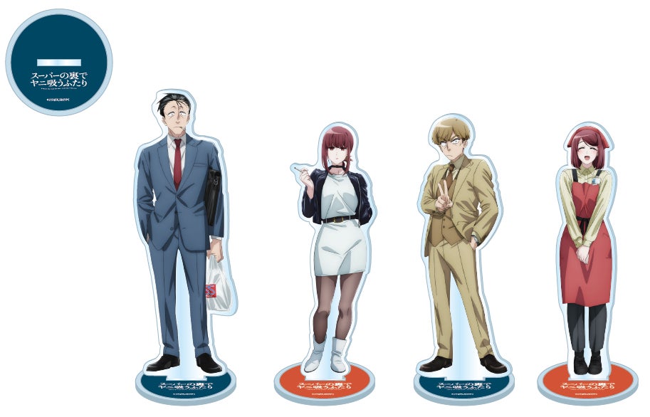 TVアニメ「スーパーの裏でヤニ吸うふたり」のキャラクターや世界観を楽しめるグッズとして、コレクション性の高いアクリルスタンドやトレーディングアイテムのほか、日常使いできるマグカップやトートバッグ、Tシャツなどを展開いたします。
