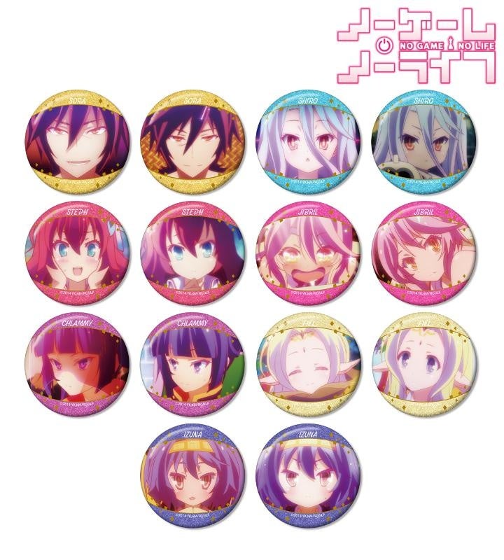 空、白、ステファニー・ドーラ、ジブリール、クラミー・ツェル、フィール・ニルヴァレン、初瀬いづなの印象的なシーンをグリッター加工を施した缶バッジに仕上げました。