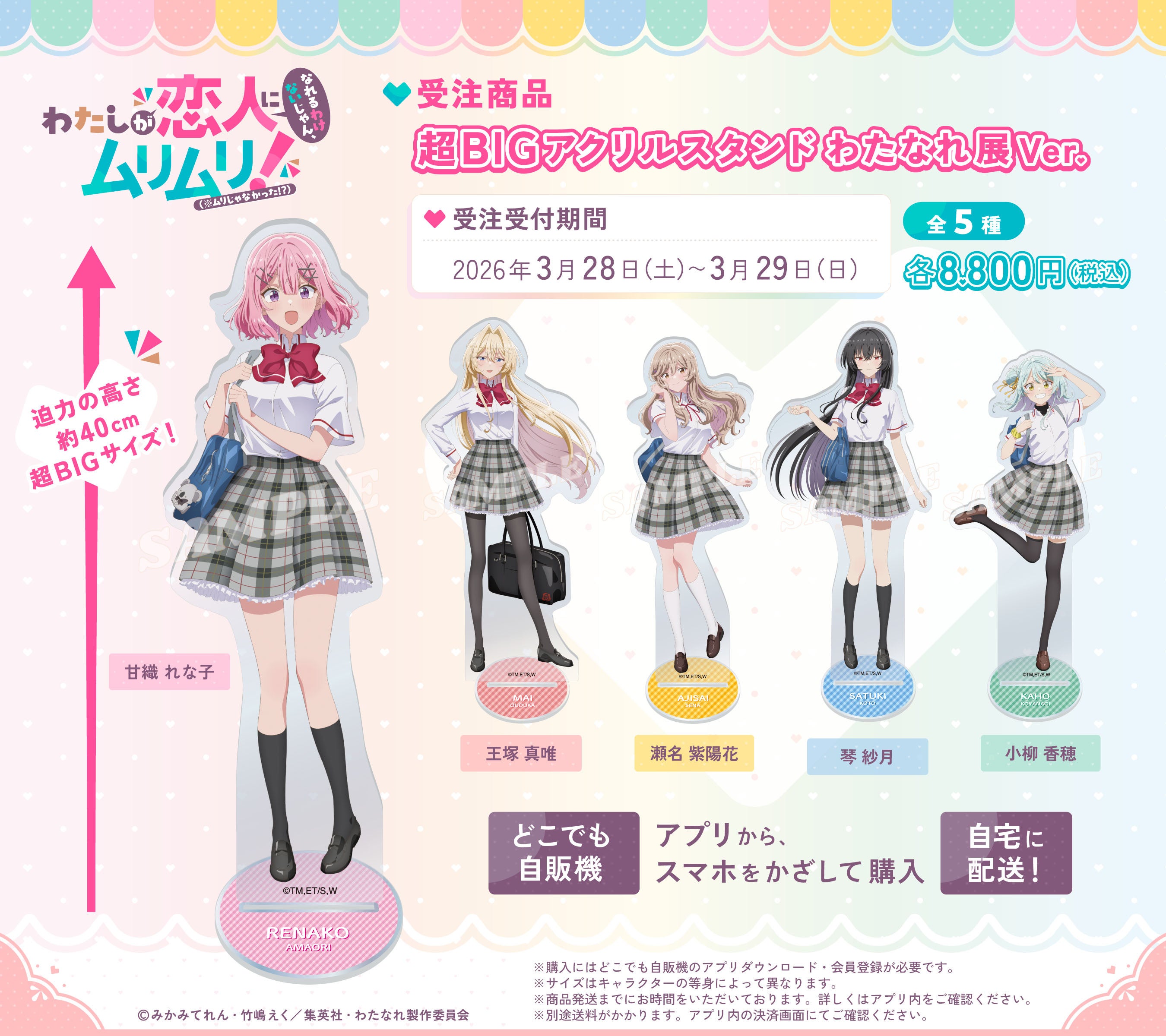 本ブースでは、TVアニメ『わたしが恋人になれるわけないじゃん、ムリムリ!(※ムリじゃなかった!?)』展示会(わたなれ展)描き下ろしイラストの「超BIGアクリルスタンドわたなれ展Ver.」(全長約40cm)を受注販売します。ブースに掲示の自販機ポスターにスマホアプリ「どこでも自販機」をかざすと、AR表示によりバーチャルな自動販売機が表示され、商品を購入することができます。受注販売で後日配送されるため、大型グッズを会場から持ち帰る手間がかかりません。